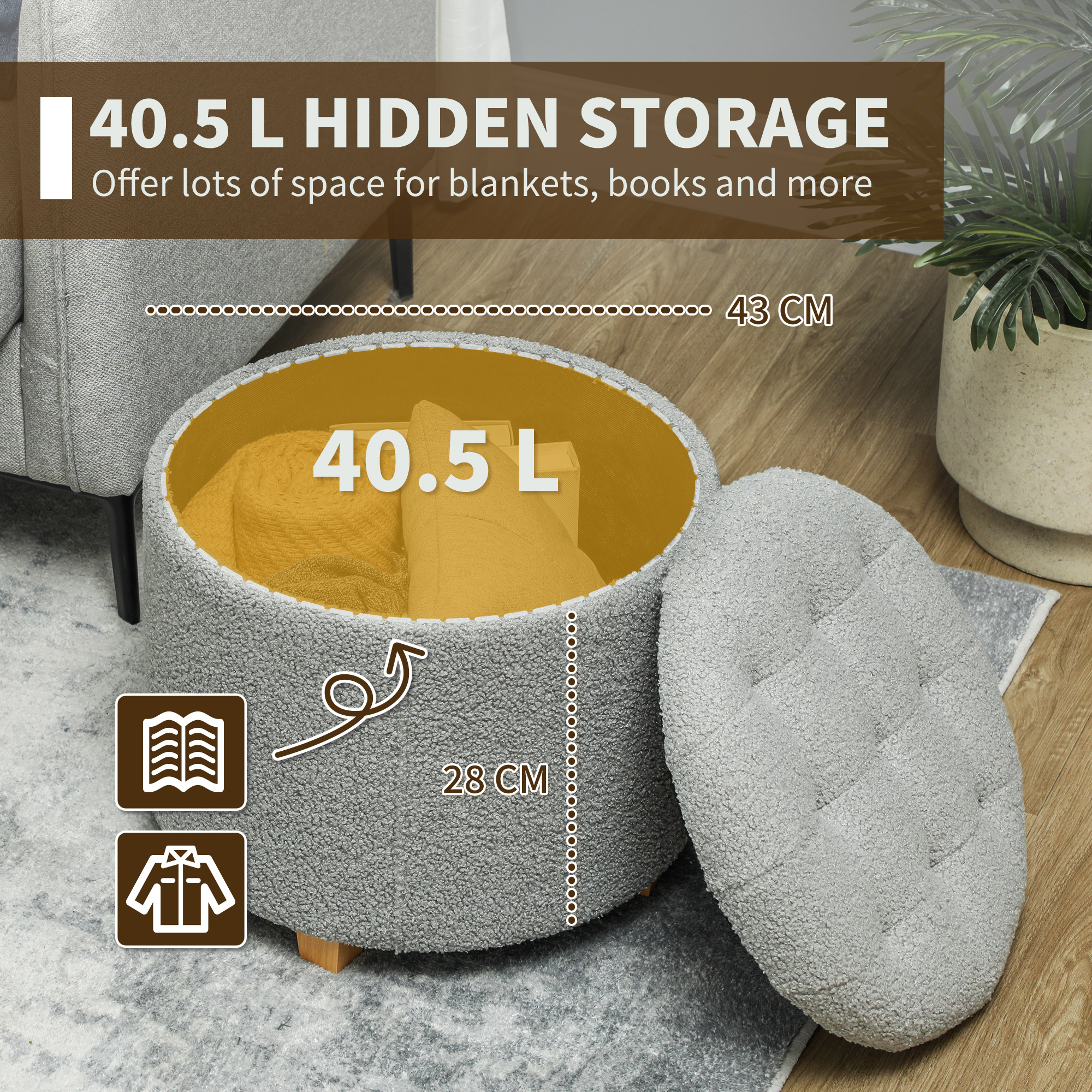Not just a soft and comfortable piece to sit on when needed, this HOMCOM ottoman gives you handy storage for smaller items. Beneath the button-tufted lid is a 40. 5L compartment, suitable for blankets, books and bits and bobs, keeping your space clutter-free. It's wrapped in teddy fleece, with a cushioned top for plenty of comfort when you sit on this piece. Bedroom storage ottoman is complete with supportive wooden legs.