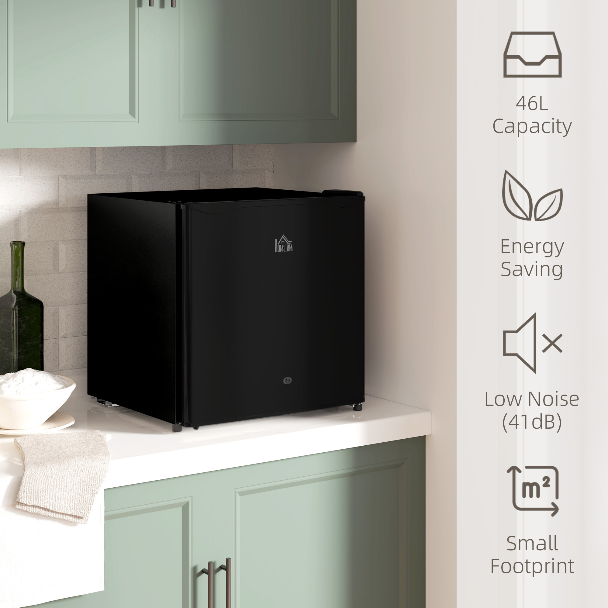 A fridge you can fit in the smallest of spaces: this HOMCOM countertop refrigerator is great for the home, office-or even your campervan. The 46L capacity makes it suitable for single use or lightly sharing with someone. With a lock on the door, you can keep food and drinks safe - two keys included. The 0-8℃ temperature can be set to five different levels easily with the wheel - choose a setting for you. Complete with a handy reversible door.