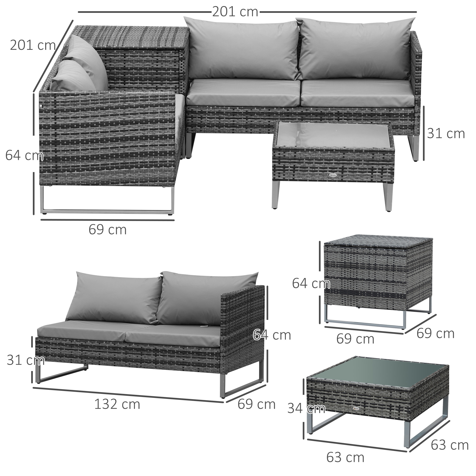 Transform your outdoor space into a haven with the Outsunny rattan garden furniture set. Designed for garden enthusiasts, this exquisite ensemble includes two elegant two-seater sofas, a chic coffee table, and a spacious storage trunk. Crafted with a robust metal frame and wrapped in weather-resistant wicker, it promises durability and style. Plush cushions ensure unparalleled comfort for long hours of relaxation, making every gathering a seamless blend of elegance and ease.