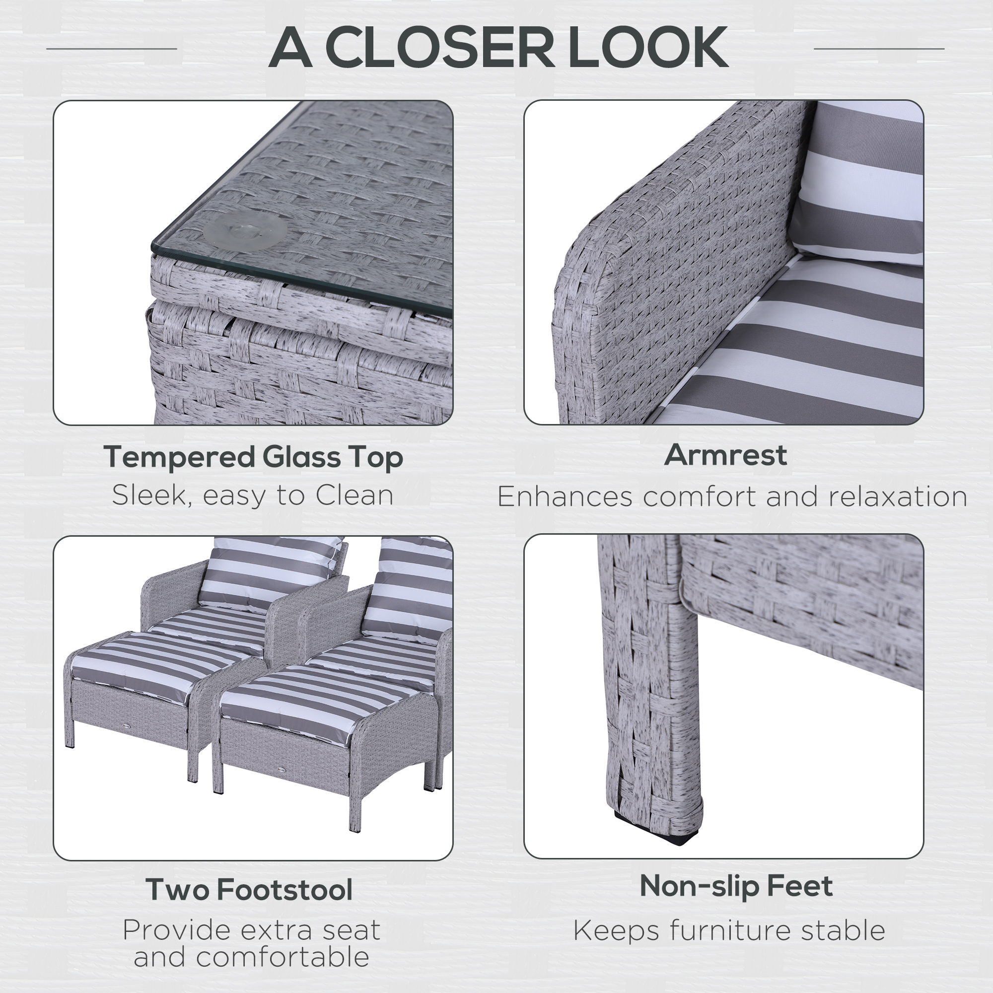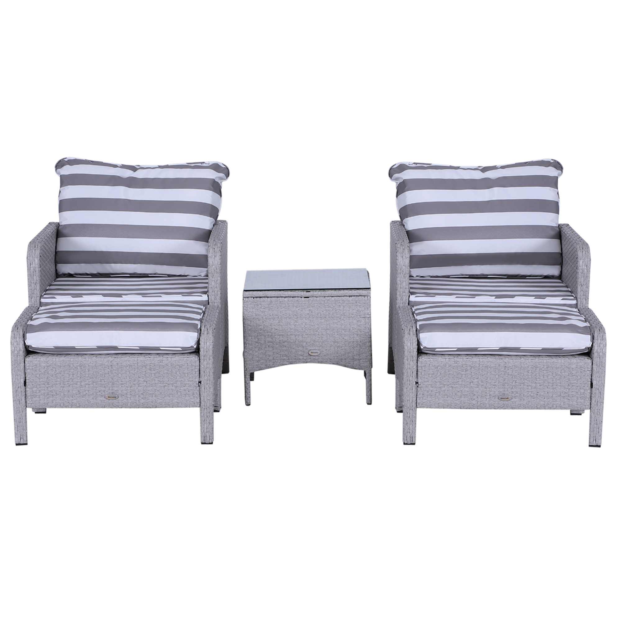 Sit back and relax in complete comfort with this rattan sofa set from Outsunny. Formed of five pieces, features two armchairs, two footstools and a matching coffee table. Made from hand woven PE rattan, with a steel frame underneath for extra support and stability. Thick padded cushions ensure you'll be relaxing comfortably for hours, You can put your feet on the footstool, or use it as an extra seat. This garden sofa set is a fantastic combination, comfortable and minimal hassle.