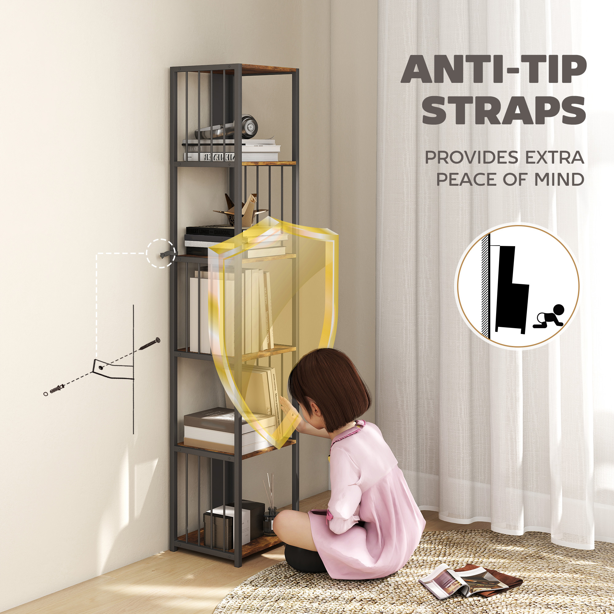 Transform your living space with the HOMCOM bookshelf, blending rustic brown wood-effect and black steel for a modern, minimalist aesthetic. Built with MDF and robust steel pipes, its anti-tip straps ensure family safety, holding up to 60 kg. Featuring five open tiers, this bookcase organizes books, photos and plants, creating a personal, clutter-free haven that enhances your sense of belonging and accomplishment.