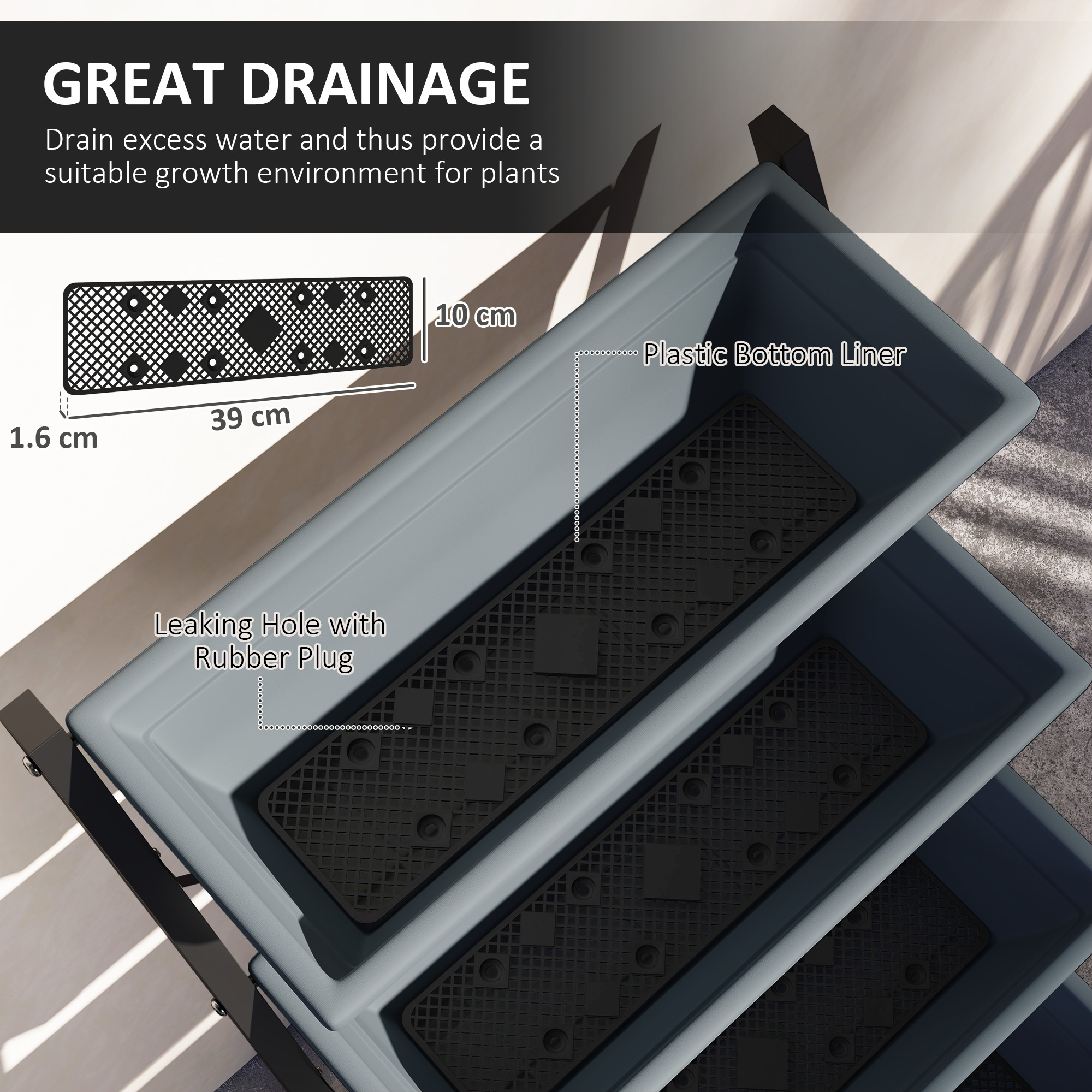 - Drainage holes with removable rubber plugs prevent waterlogging