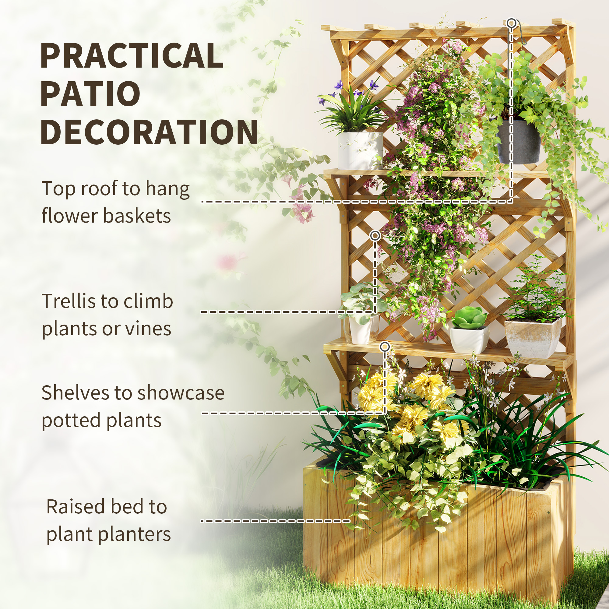 Even more greenery comes to life with our Outsunny raised planter. With a 146. 5 cm trellis and two shelves, there's extra growing space for climbing plants, vines and plant pots. Made from fir wood, this planter is a naturally tough piece suitable for outdoor use, all year round.