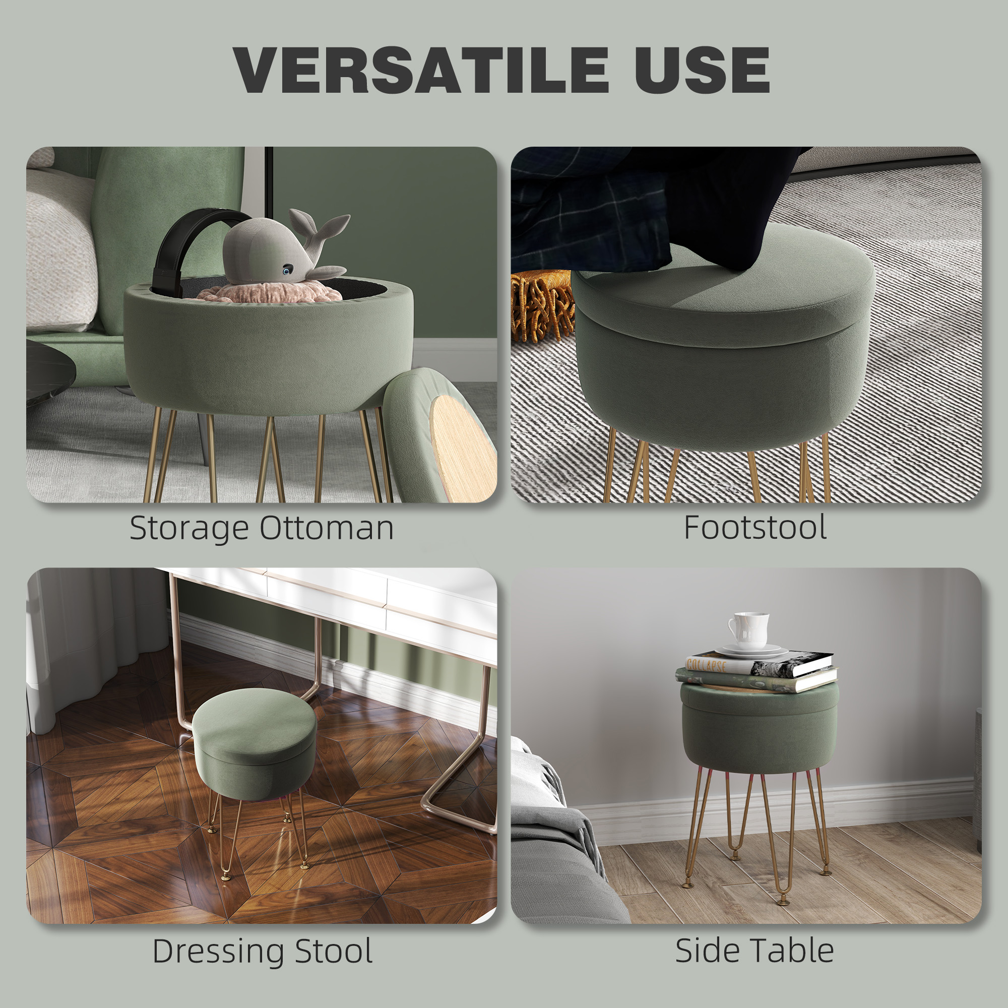 Luxurious functionality in the home with this HOMCOM ottoman. Inside it has a 5L storage space, making room for plenty of smaller items. Wrapped in velvet-feel upholstery this is a soft and beautiful piece which looks great wherever you stand it, complete with gold coloured metal hairpin legs for strong support.