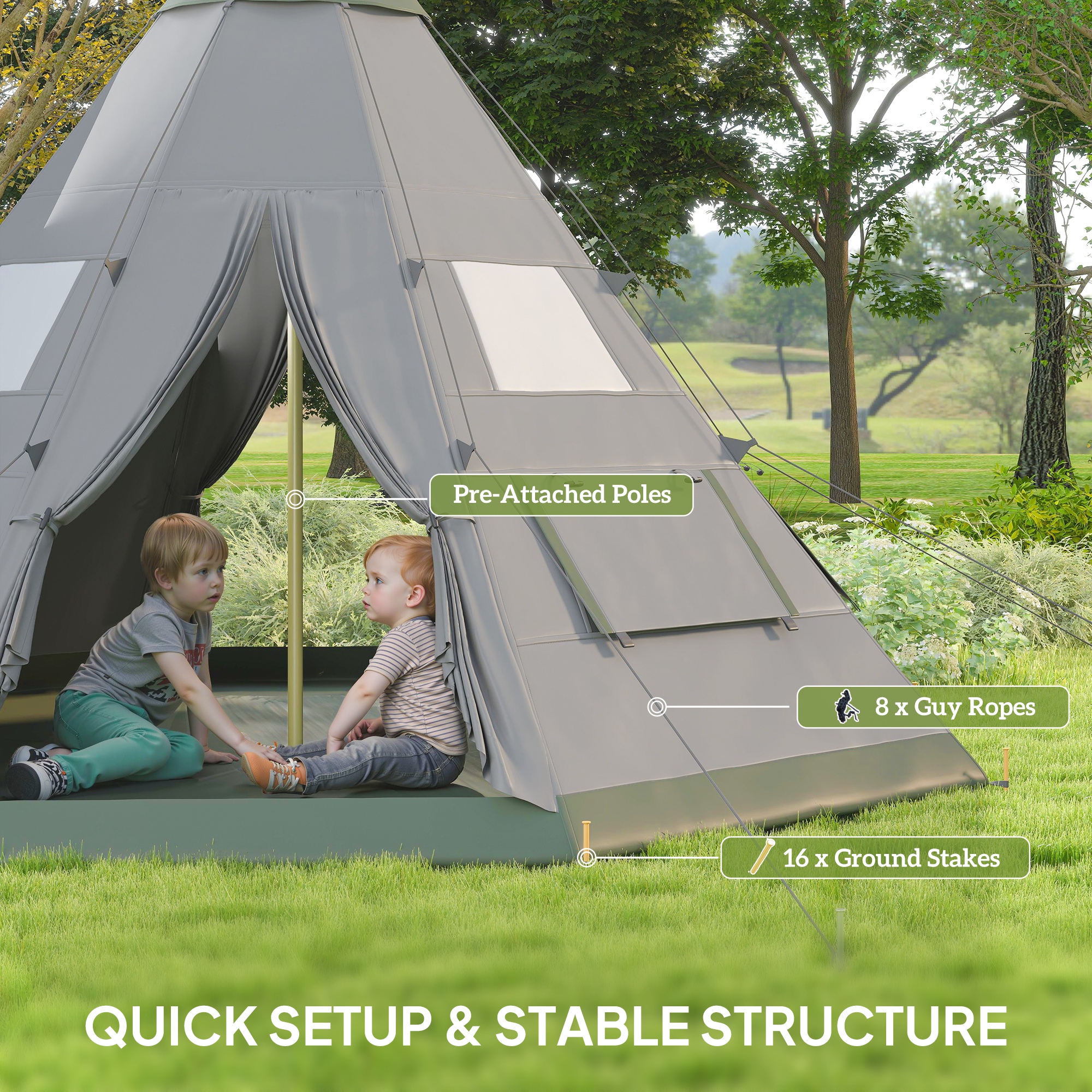 Turn your camping trips into a fun experience like never before – opt for this six-man tipi tent from Outsunny. Roomy and spacious inside so everyone can sleep and relax with plenty of room, pre-attached metal poles ensure set-up is easy, whilst ensuring a tough structure which keeps upright and in place all day long. Mesh windows are placed all over to allow air to circulate inside, with a large zipped door for easy access in and out. Compact when folded for easy carrying with the included bag. Ground stakes and guy ropes also included.