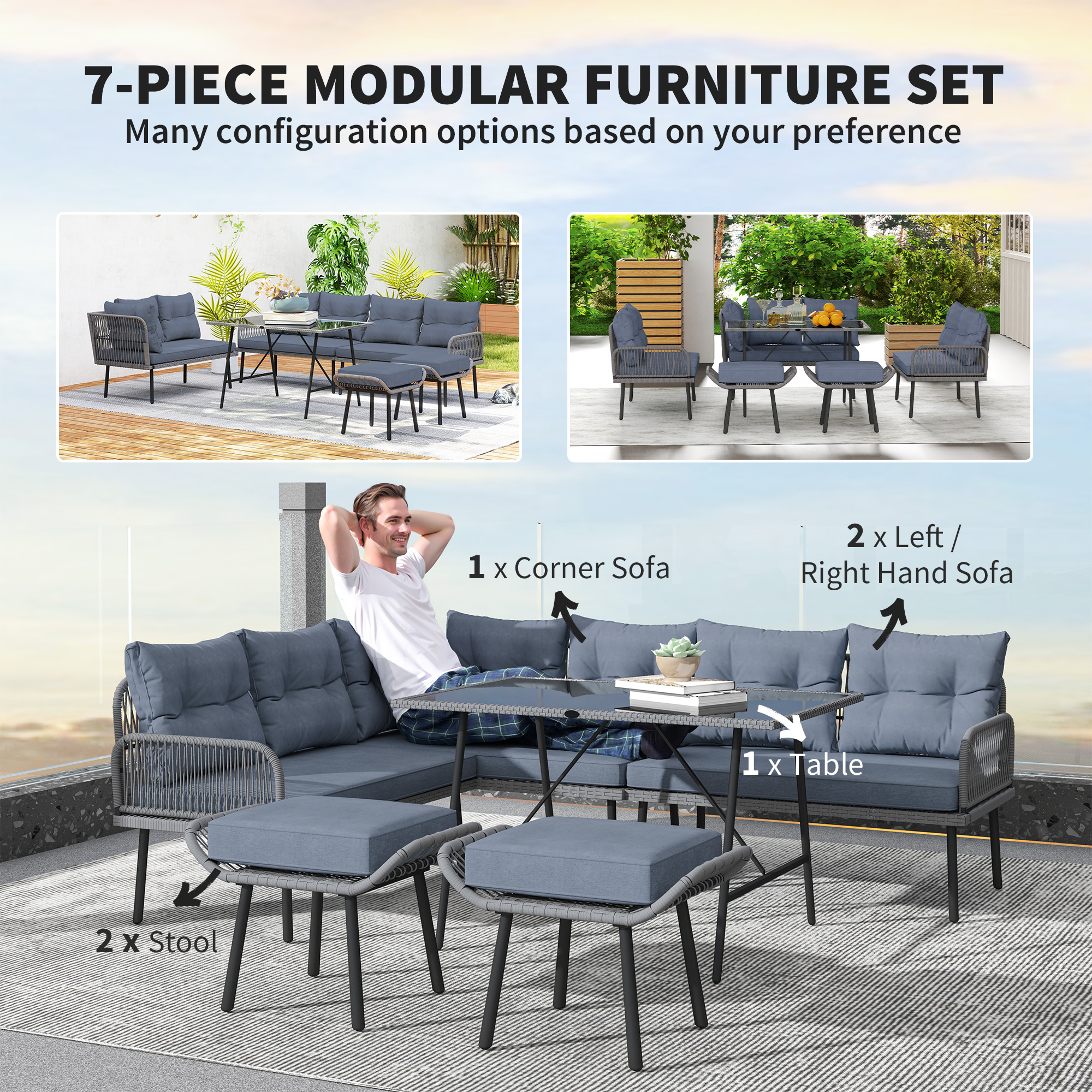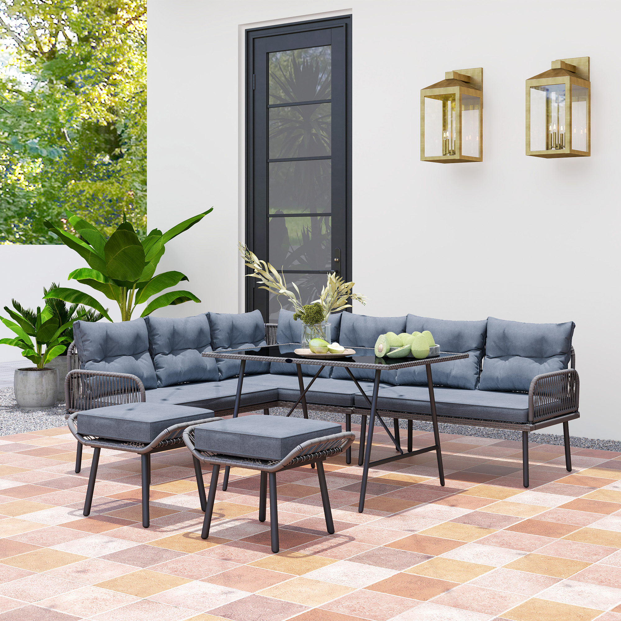 Transform your garden into a relaxing haven with the Outsunny 6-piece garden sofa set. This versatile outdoor garden furniture includes two left/right-hand sofas, a cosy corner sofa, a table and two stools, all designed for customizable configurations. Crafted with robust steel and wrapped in all-weather wicker PE rattan, paired with plush cushions, it's a great choice for outdoor lounging.
