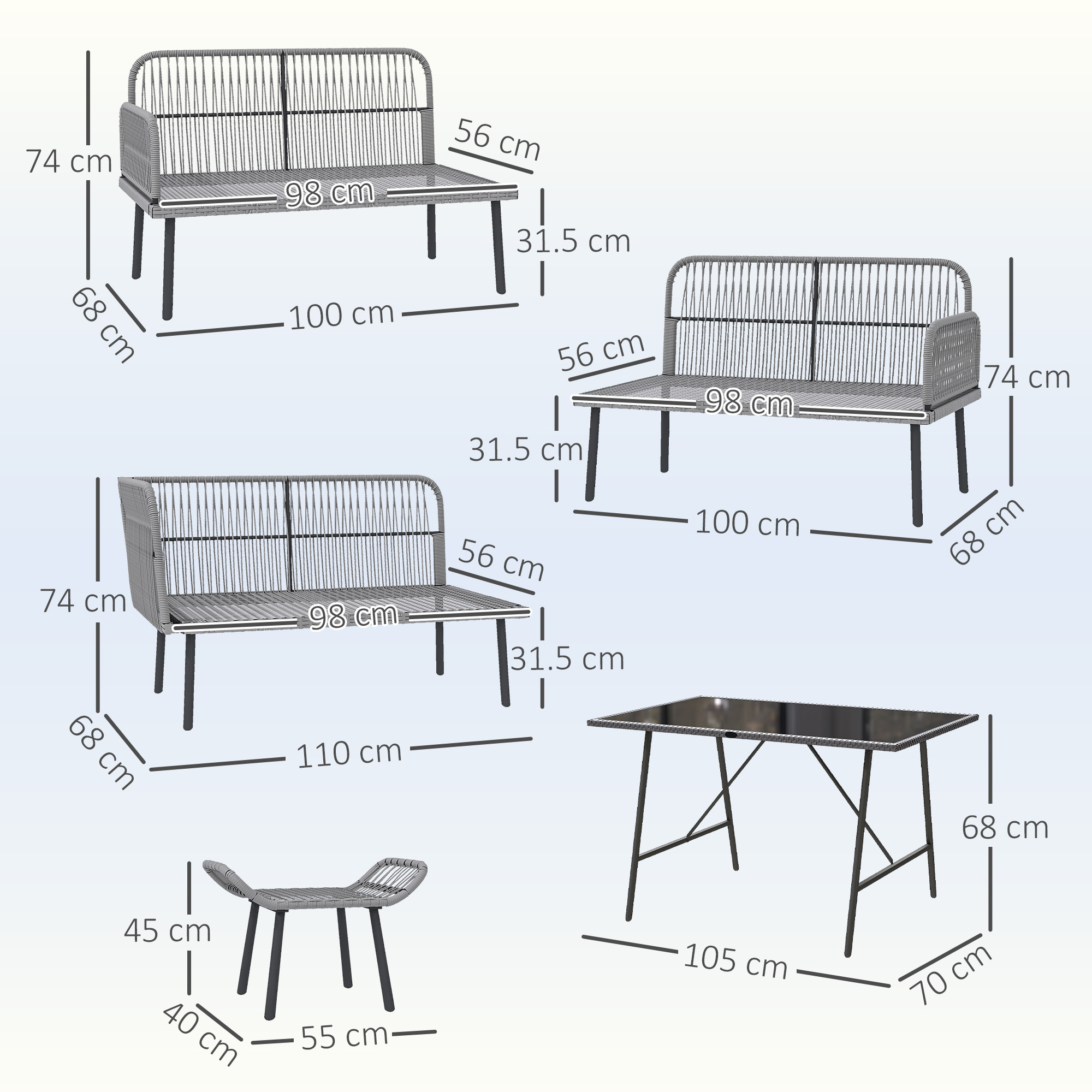 - Weight Capacity: 240 kg (loveseat), 75 kg (table), 120 kg (stool)