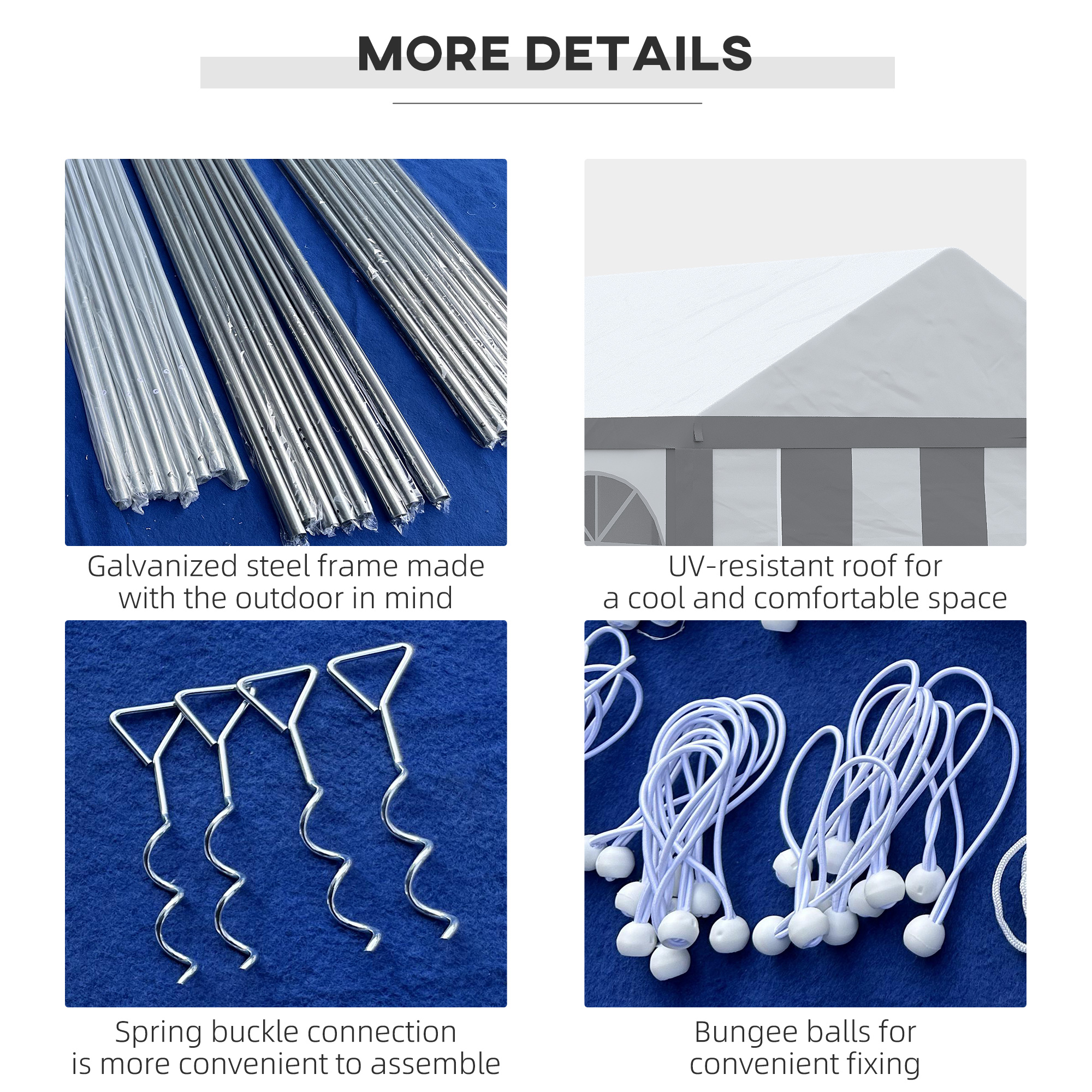 - Four guy ropes, four spiral stakes and 16 ground stakes included to pin to the ground