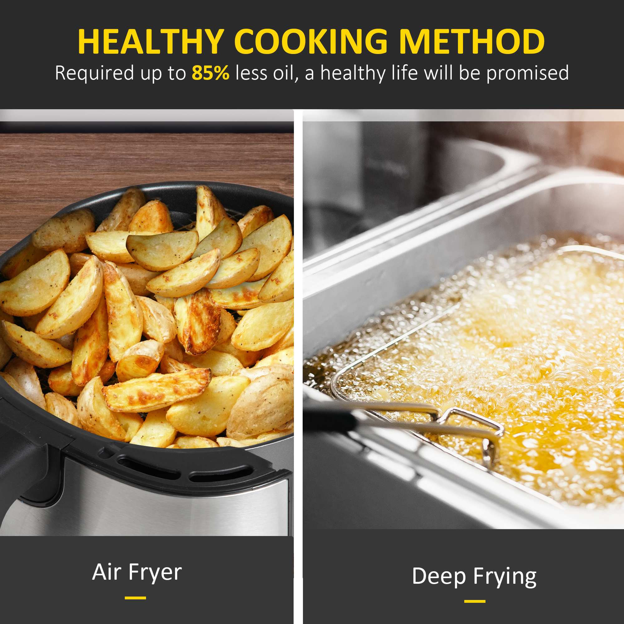 The healthier way to cook. Bring this HOMCOM large air fryer amongst your kitchen appliance set up, allowing you to cook pretty much anything you want in a variety of ways. LED screen for easy control, comes with 8 cooking programmes - temperature adjustable between 80-200 °C - you can cook a whole variety of food, from meats, to fish, vegetables and desserts. The 6. 5L basket holds a lot, meaning you can use this air fryer oven for the whole family.
