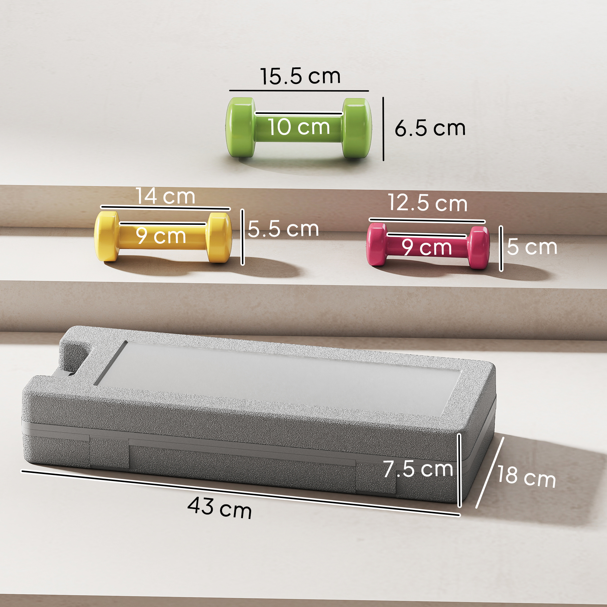 - Dimensions: Box: 7. 5H x 43L x 18Wcm. Dumbbell dimensions: 2 x 0. 5kg: 5H x 12. 5L x 5Wcm. 2 x 1kg: 5. 5H x 14L x 5. 5Wcm. 2 x 1. 5kg: 6. 5H x 15. 5L x 6. 5Wcm