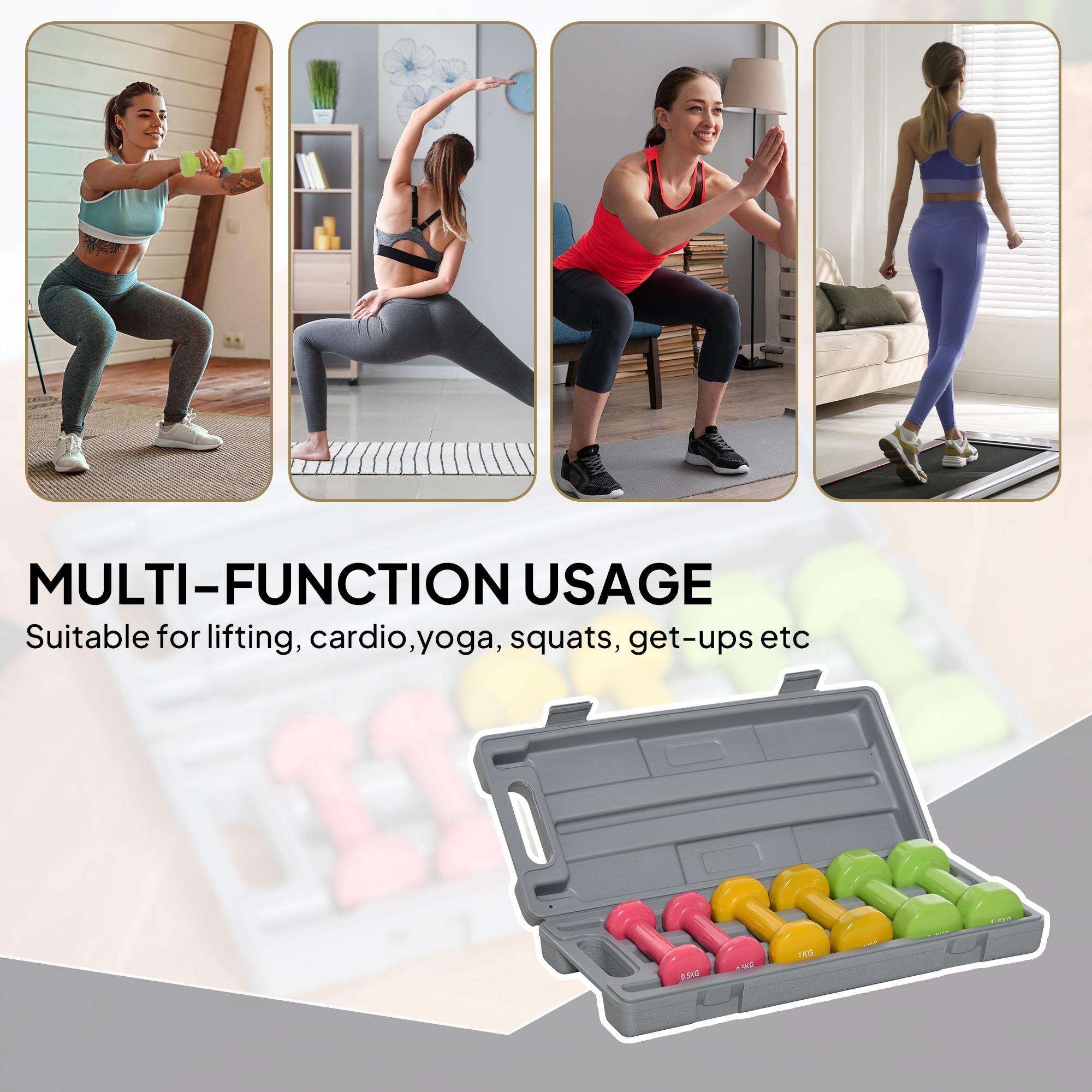 - Three pairs of colourful dumbbells, weighing 0. 5kg, 1kg and 1. 5kg respectively, satisfying your different training needs