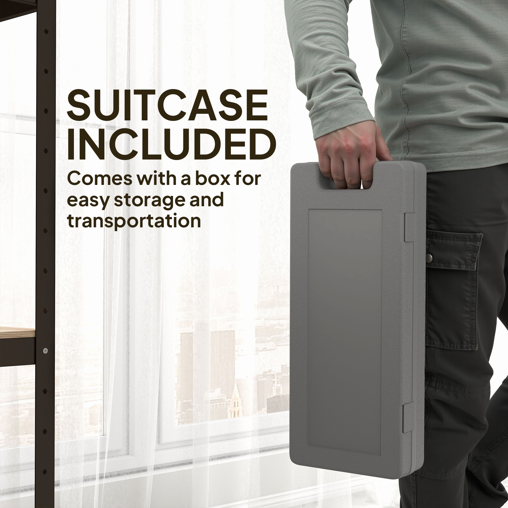 - Suitcase included for simple storage and travel
