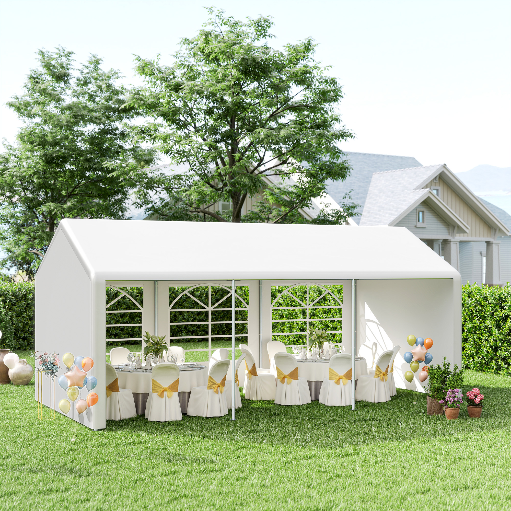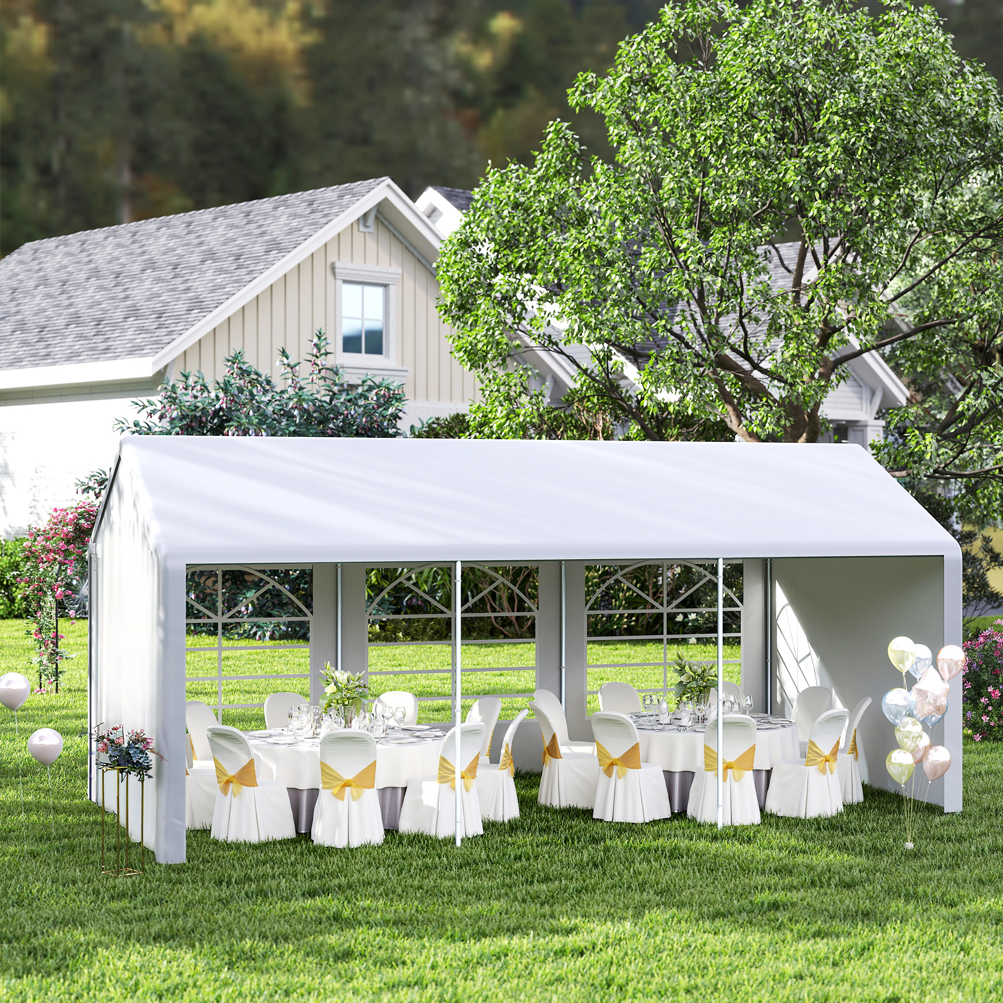This large three-room party gazebo from Outsunny can be used not only to protect your car, but create a shelter for outdoor gatherings and parties. Made of tough powder coated and galvanized steel, the frame is tough and strong, standing steadily upright and in place. The thick PE plastic canopy creates safe shelter, with a zipped door for easy access. It's finished with three windows on both sides, each with a roll-up cover. The stylish large gazebo for keeping your car clean and protected.