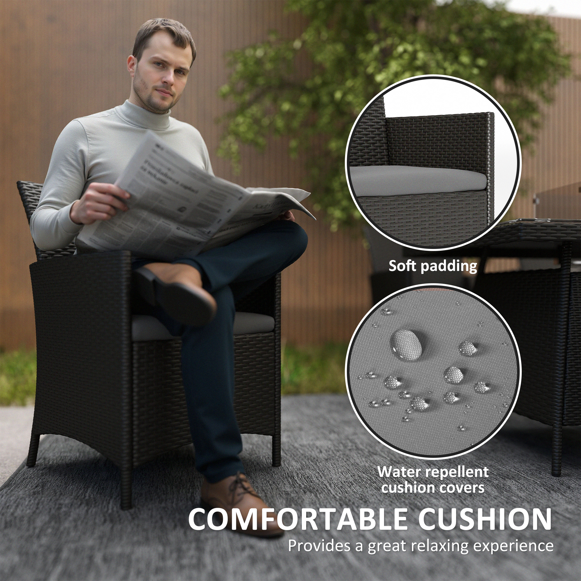 Gather round with company, with the great amount of warmth and ambience. This Outsunny outdoor garden furniture set comes with six armchairs and a fire pit table. The table is fitted with a 50,000 BTU burner in the middle which expels a smokeless and clean burn to ensure an enjoyable and smokeless atmosphere. The glass windscreen creates a safe shield against the flame. All pieces have a strong metal frame with solid plastic wicker. Sink into comfort with the included padded seat cushions.