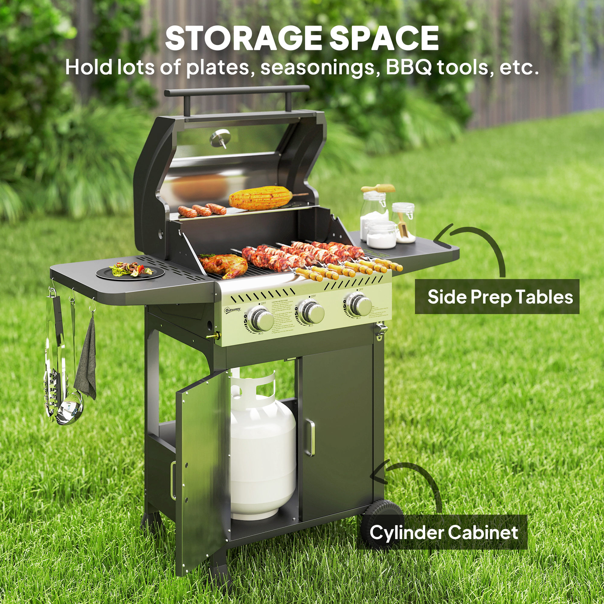 - Cylinder cabinet stores gas safely, side racks for utensils
