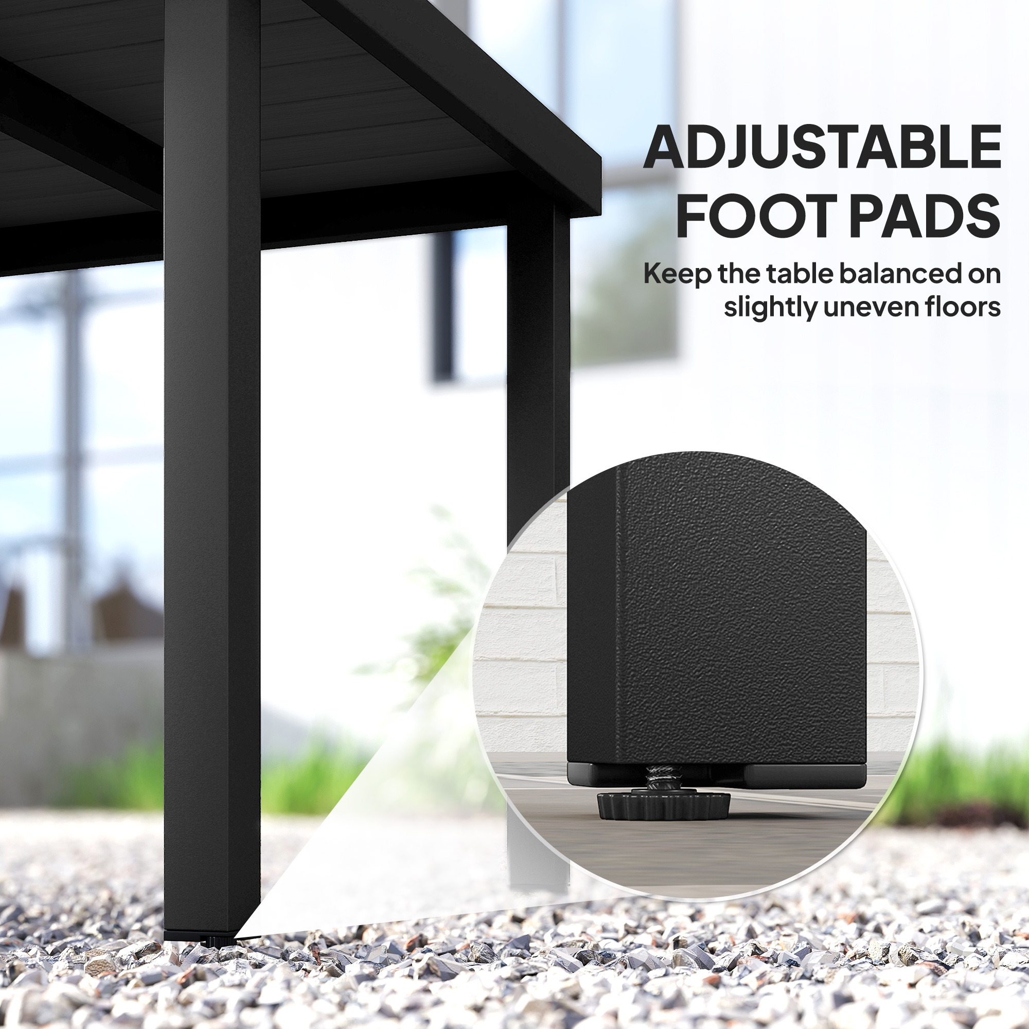 Serve dinner and seat 4 with Outsunny. This garden dining table is ready and stable whether placed on the patio, porch, or any other outdoor area. Made of water and weather-resistant plastic, it still offers the rustic style with less weight and easy cleanup. Supported by a square aluminium frame, it provides lots of space for 4 diners. This outdoor dining table on the balcony is great for dinner, drinks, afternoon tea, or coffee.