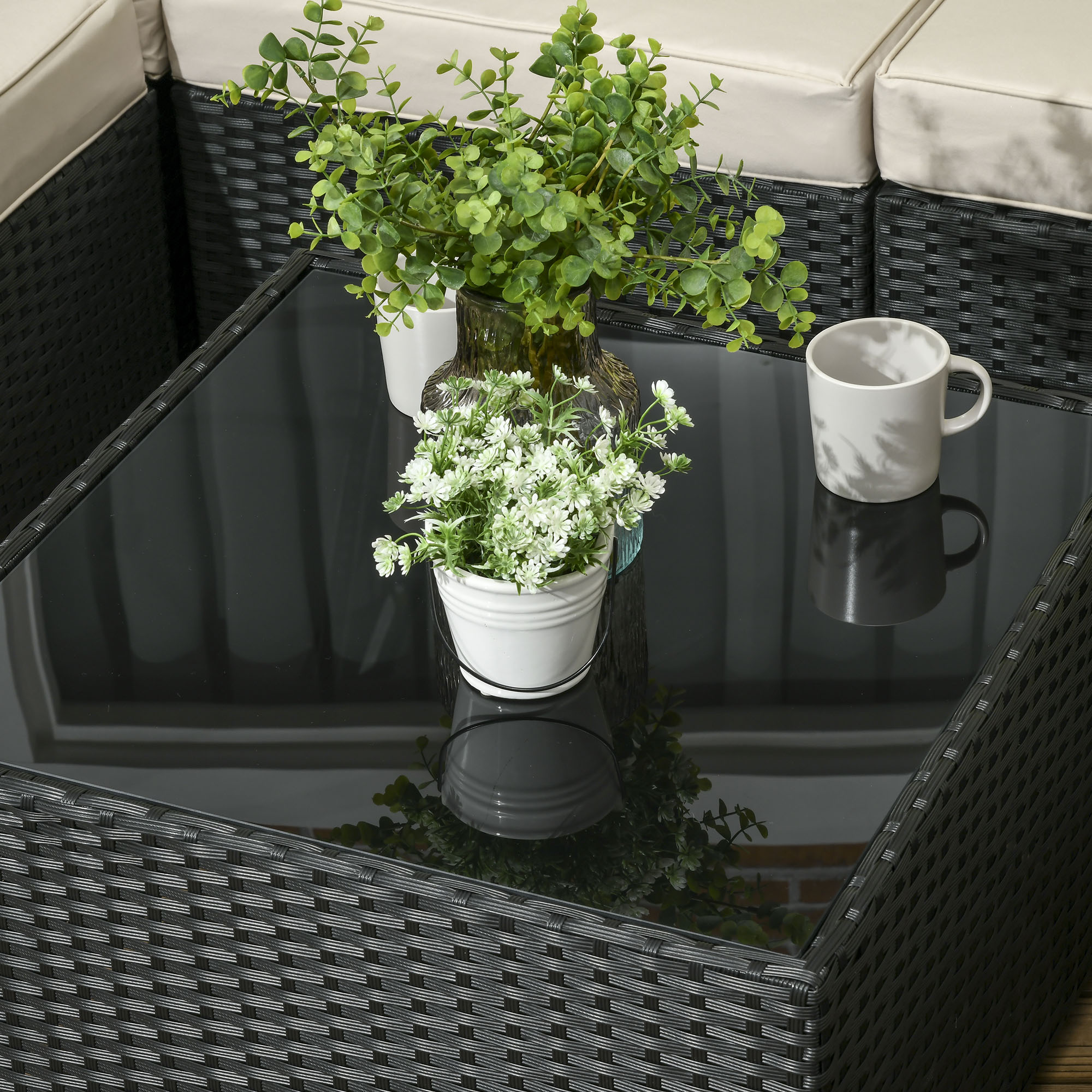 Make your garden stand out like never before. Say hello to this Outsunny garden corner sofa set. Each piece has a steel frame for strong support, wrapped in plastic wicker for double the durability; also creating a forever-stylish set for your outdoor space. Comes with two corner seats, four normal seats, a footstool and table - set up into a shape which you want. Padded cushions for comfort, with four coloured cushions for a touch of bold beauty.