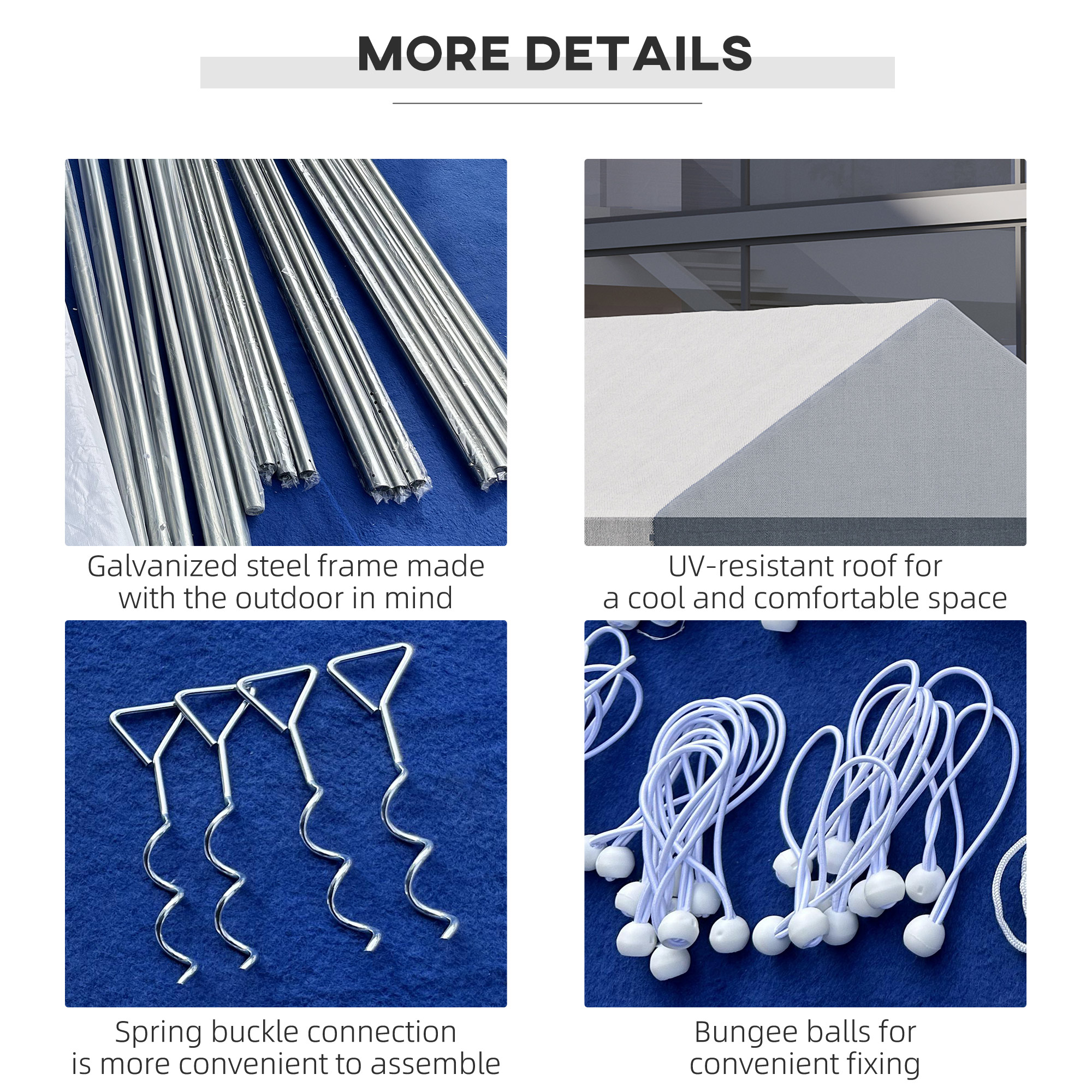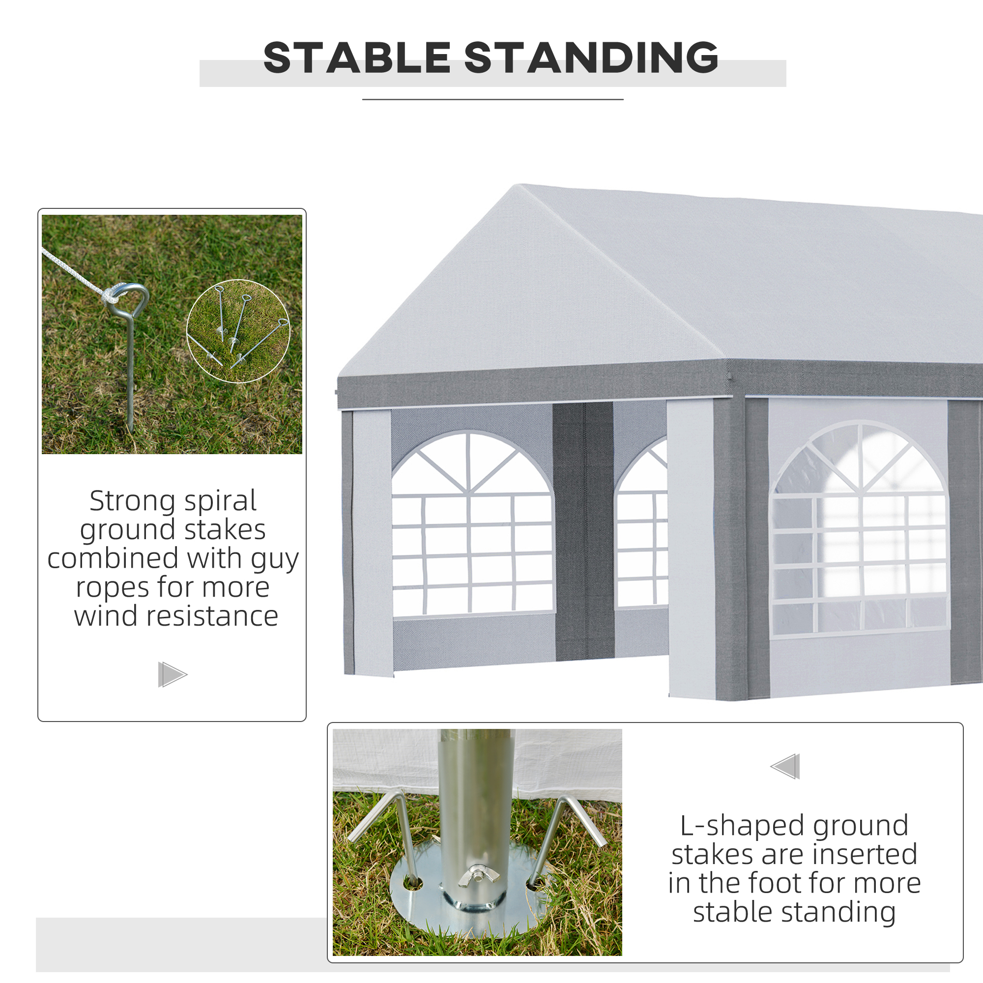 - Four guy ropes, four spiral stakes and 20 ground stakes included to pin to the ground