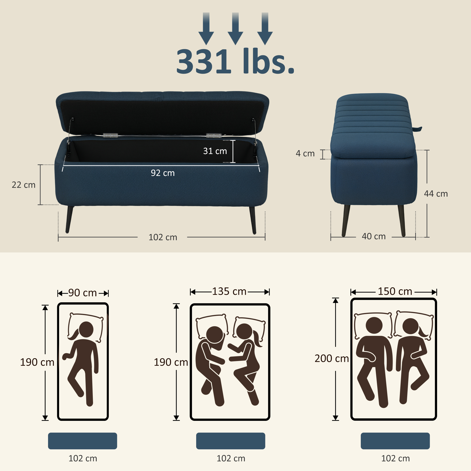 Style and storage? Do it in unison with this HOMCOM ottoman. Keeping it neutral with the dark blue colour, this is a versatile piece which welcomes itself easily into many home style. It comes with a 92 x 31cm inner storage space - great for keeping small pieces together. The lid is padded so it works as an occasional seat. Complete with steel legs which support it, however you're using it.