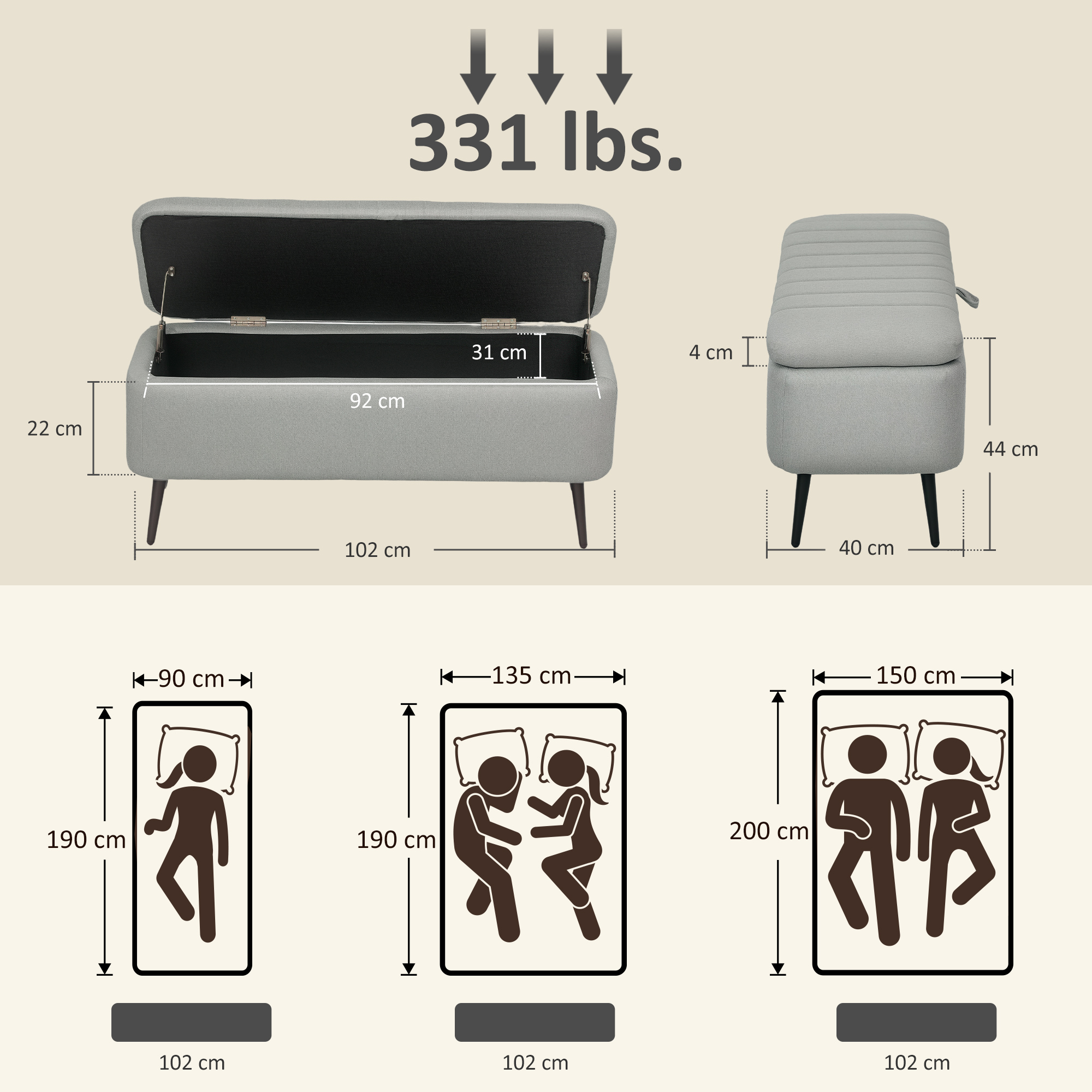 - Hidden Storage Size: 92W x 31D x 22H cm