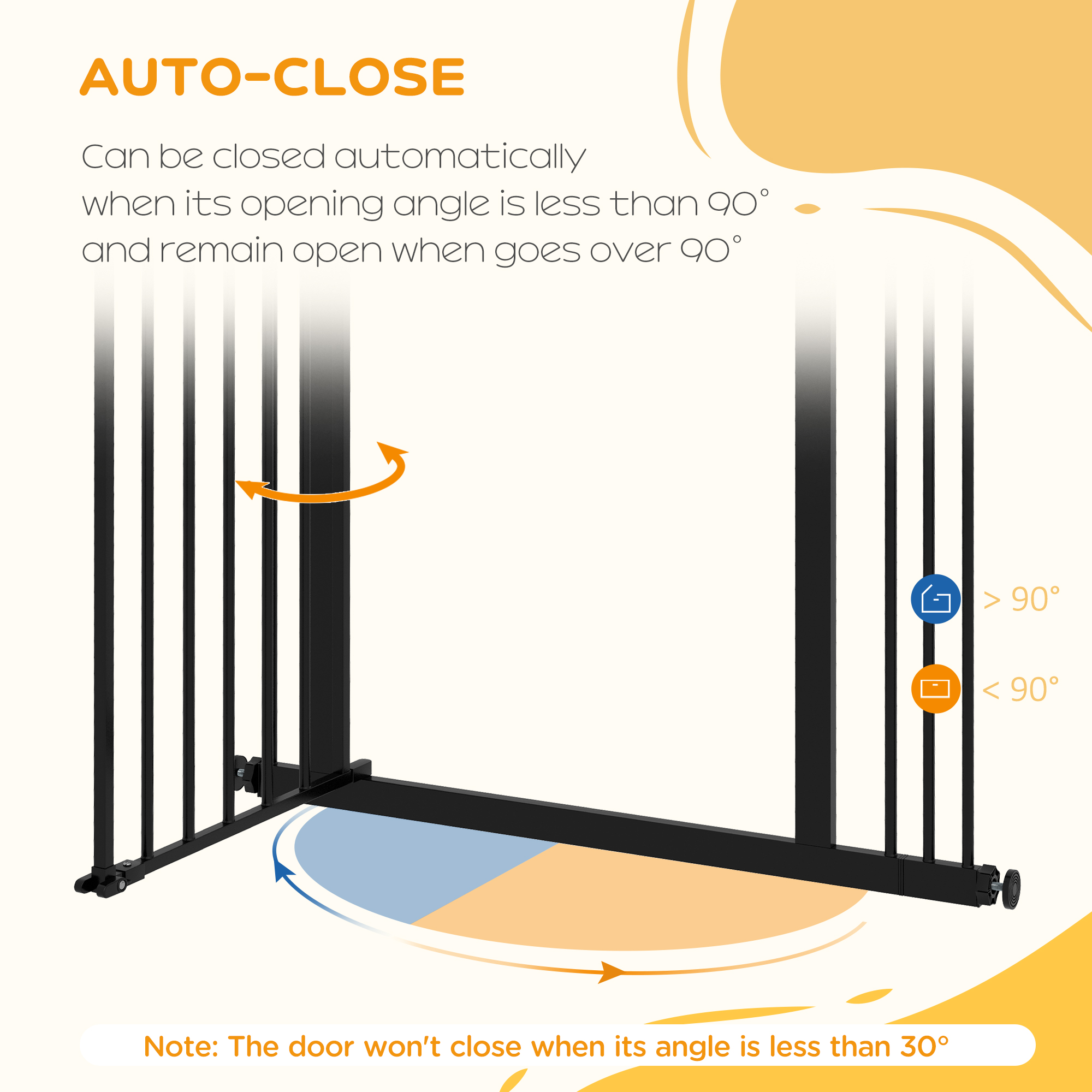 Keep pets safely out of restricted areas with this PawHut pet gate. Designed for hallways, doorways and staircases, its adjustable width fits various openings with ease. The strong metal frame is strong and stable, with a pet-safe, lead-free finish. The door closes and locks automatically when left open between 30°–90°, offering extra peace of mind. With accessories included, setup is quick and simple – great for busy homes with curious pets.