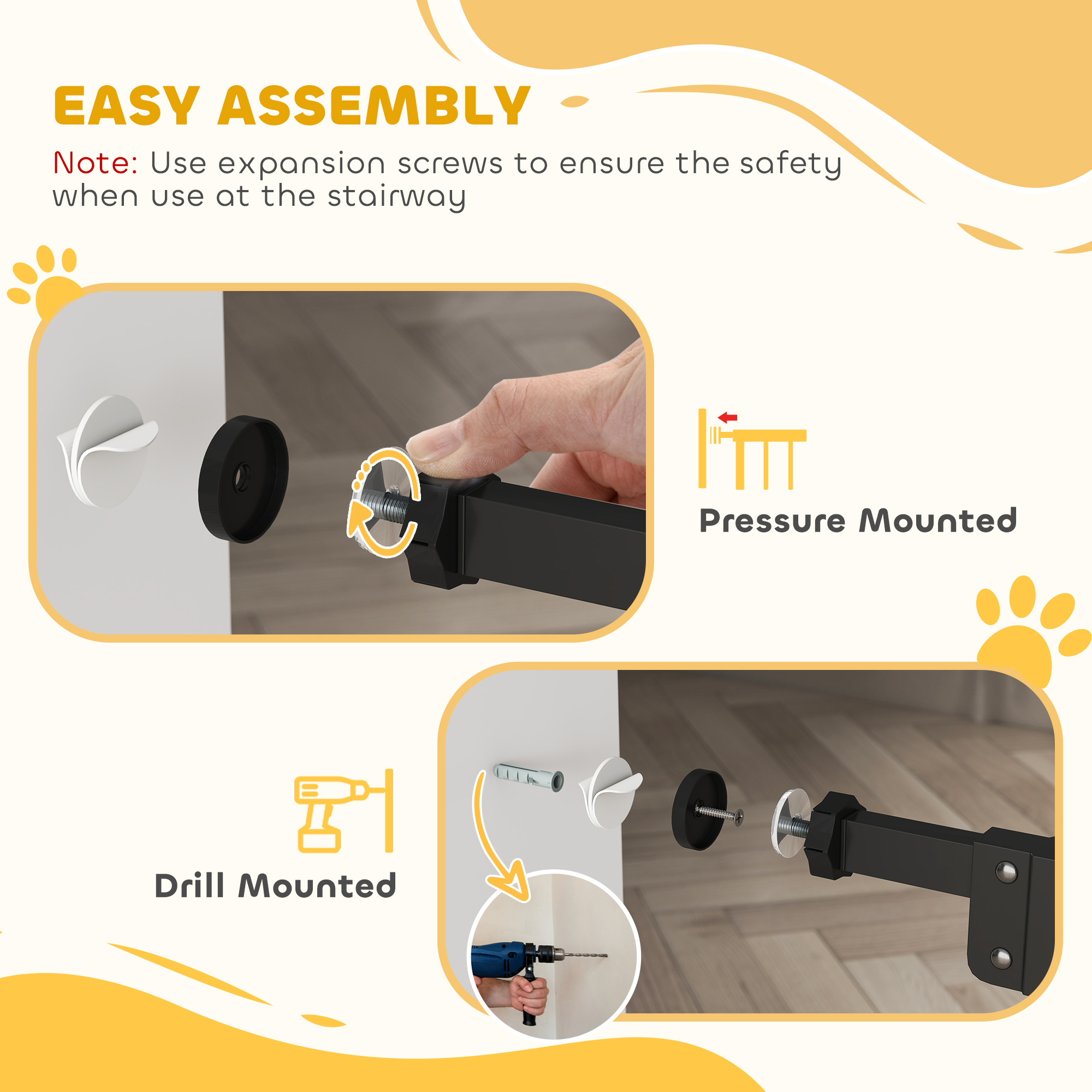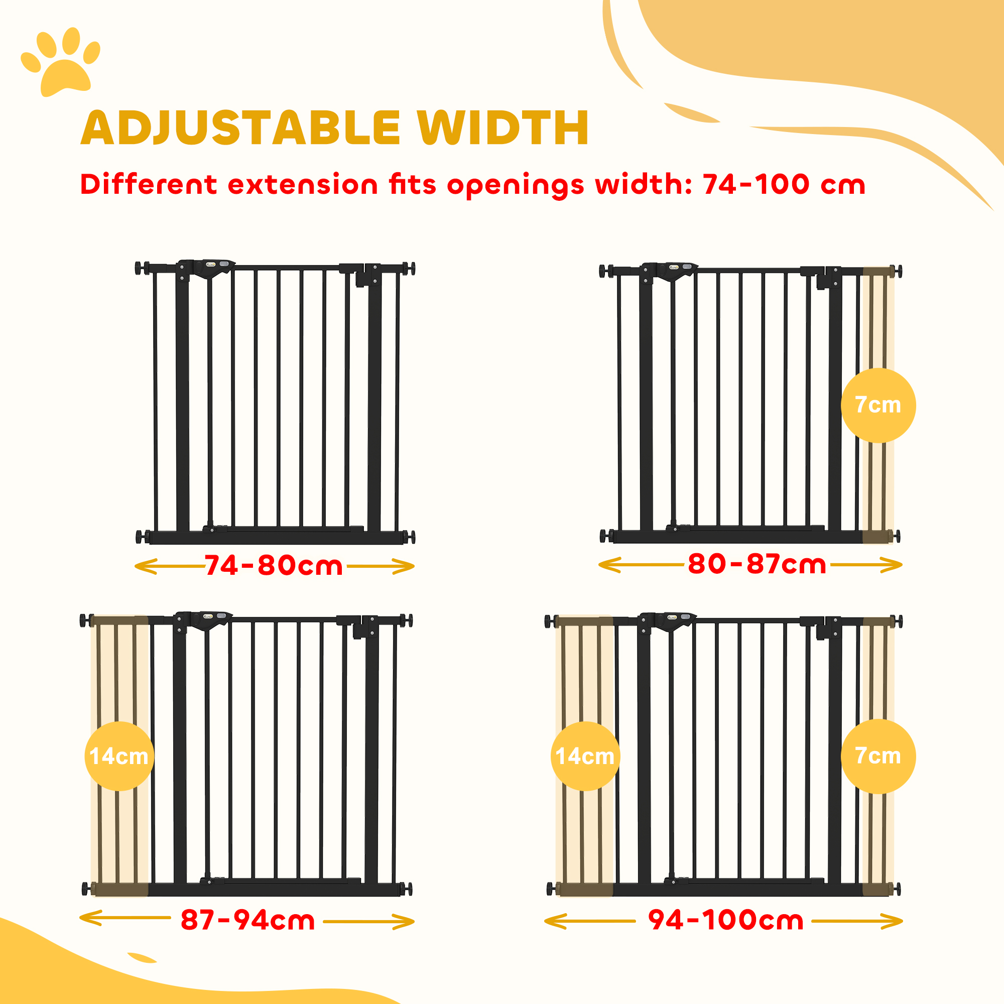 Keep pets safely out of restricted areas with this PawHut pet gate. Designed for hallways, doorways and staircases, its adjustable width fits various openings with ease. The strong metal frame is strong and stable, with a pet-safe, lead-free finish. The door closes and locks automatically when left open between 30°–90°, offering extra peace of mind. With accessories included, setup is quick and simple – great for busy homes with curious pets.