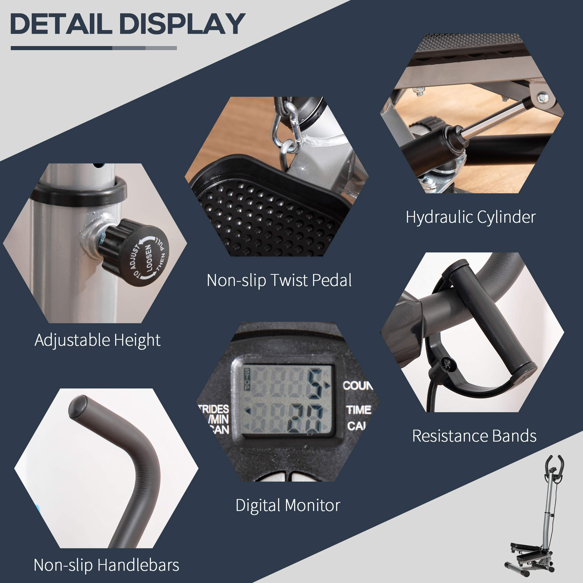 Tone your glutes and thighs with this HOMCOM fitness stepper. Build with an adjustable handlebar can offer you a full body workout, the stepping pedals works your calves, buttocks, thighs and hips. The stepper includes non-slip foot pedals, and foam handlebars for extra stability and comfort, LCD monitor screen to help keep track of time, calories burned and number of steps. Enjoy a fun and easy fitness workout at home or office!