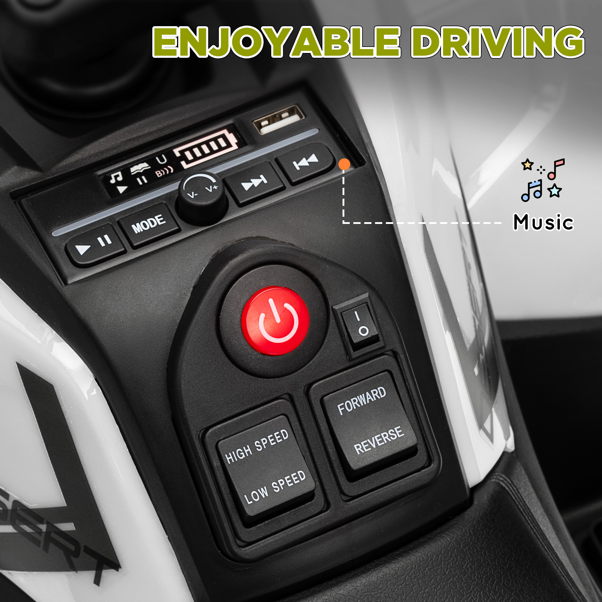 - Equipped with four headlights, music and a USB port for entertainment