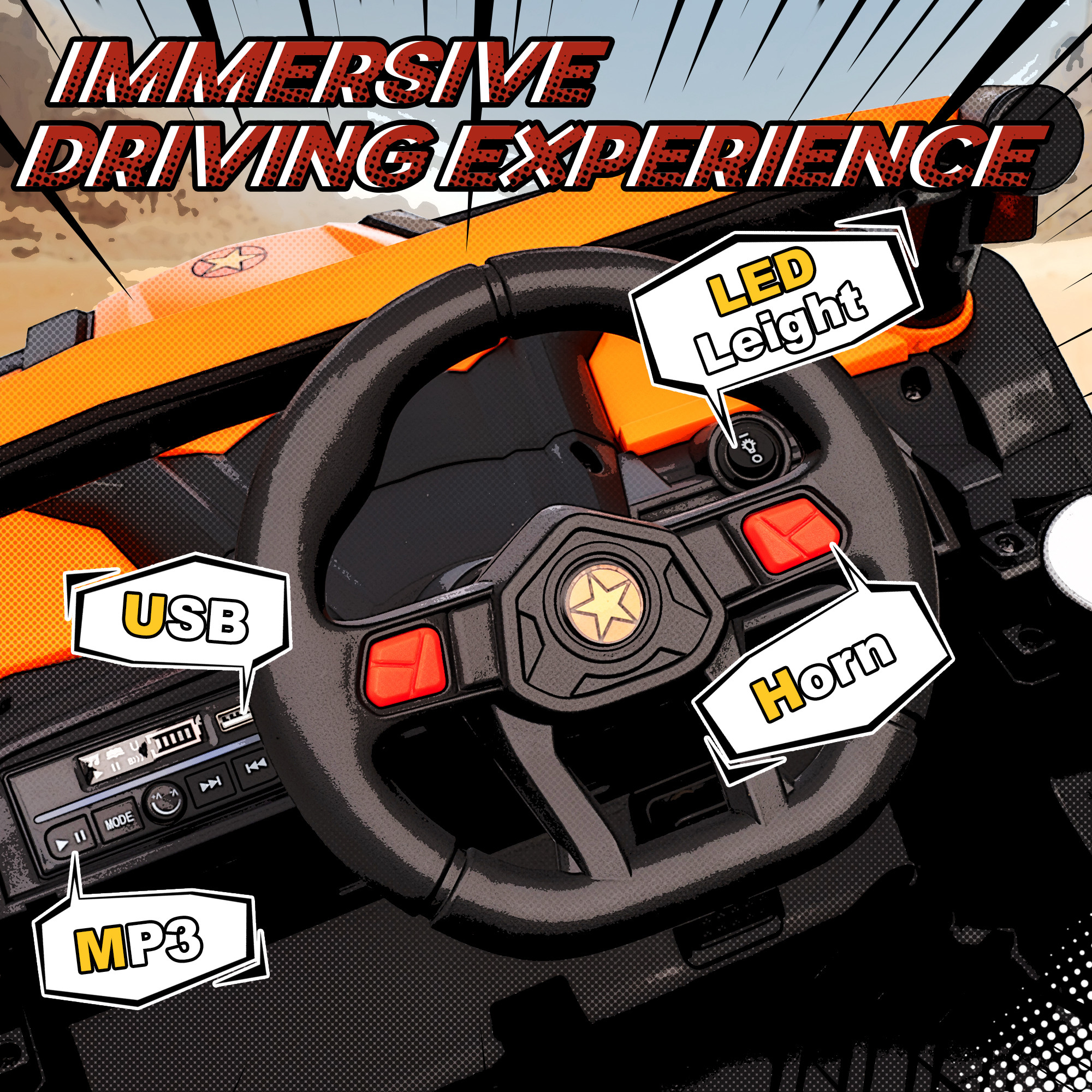 - Working lights, horn and music offer a fun, immersive UTV driving adventure