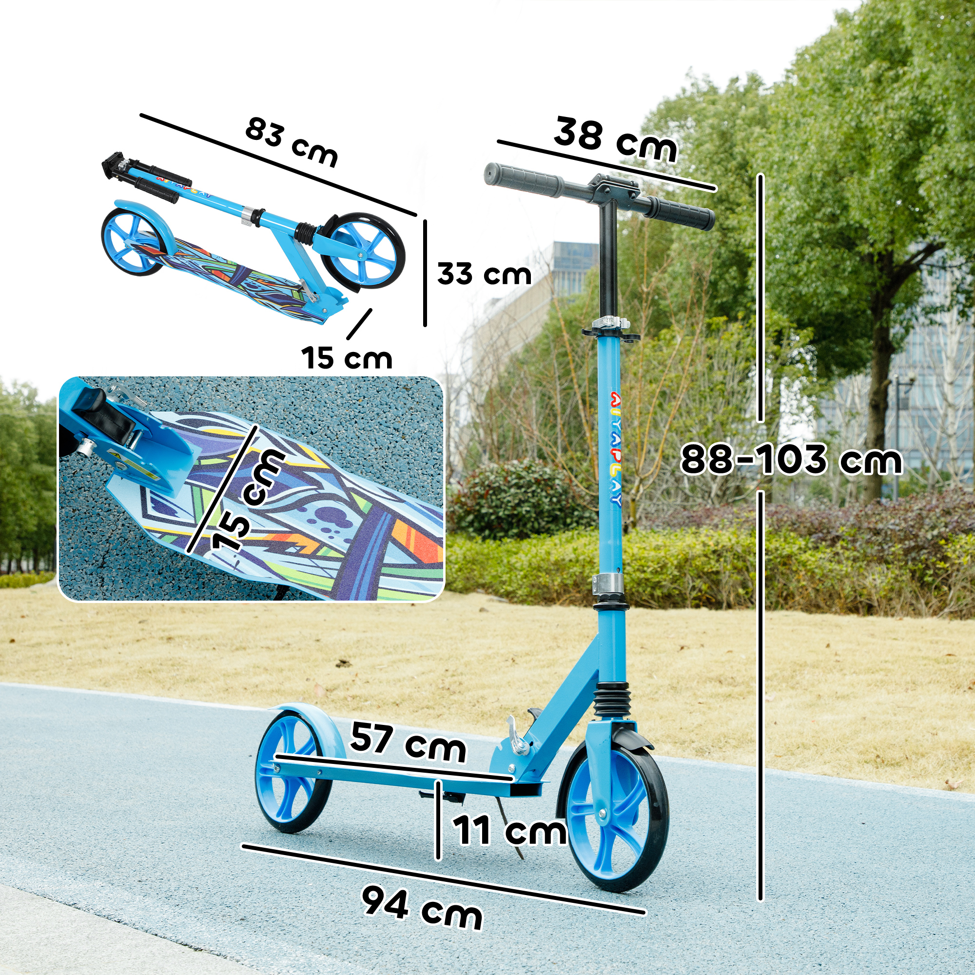 Outdoor fun is made possible with the AIYAPLAY kids scooter. Designed to grow with your child, it features four adjustable levels from 88cm to 103cm, suitable for ages 6-12 years. Smooth riding on various terrains, thanks to its front fork with shock absorption, it glides effortlessly on grass, gravel and cement. The rear brakes provide safe and swift stops. When finished, simply fold it for easy transport and space-saving storage. Great for little explorers ready for exciting adventures.