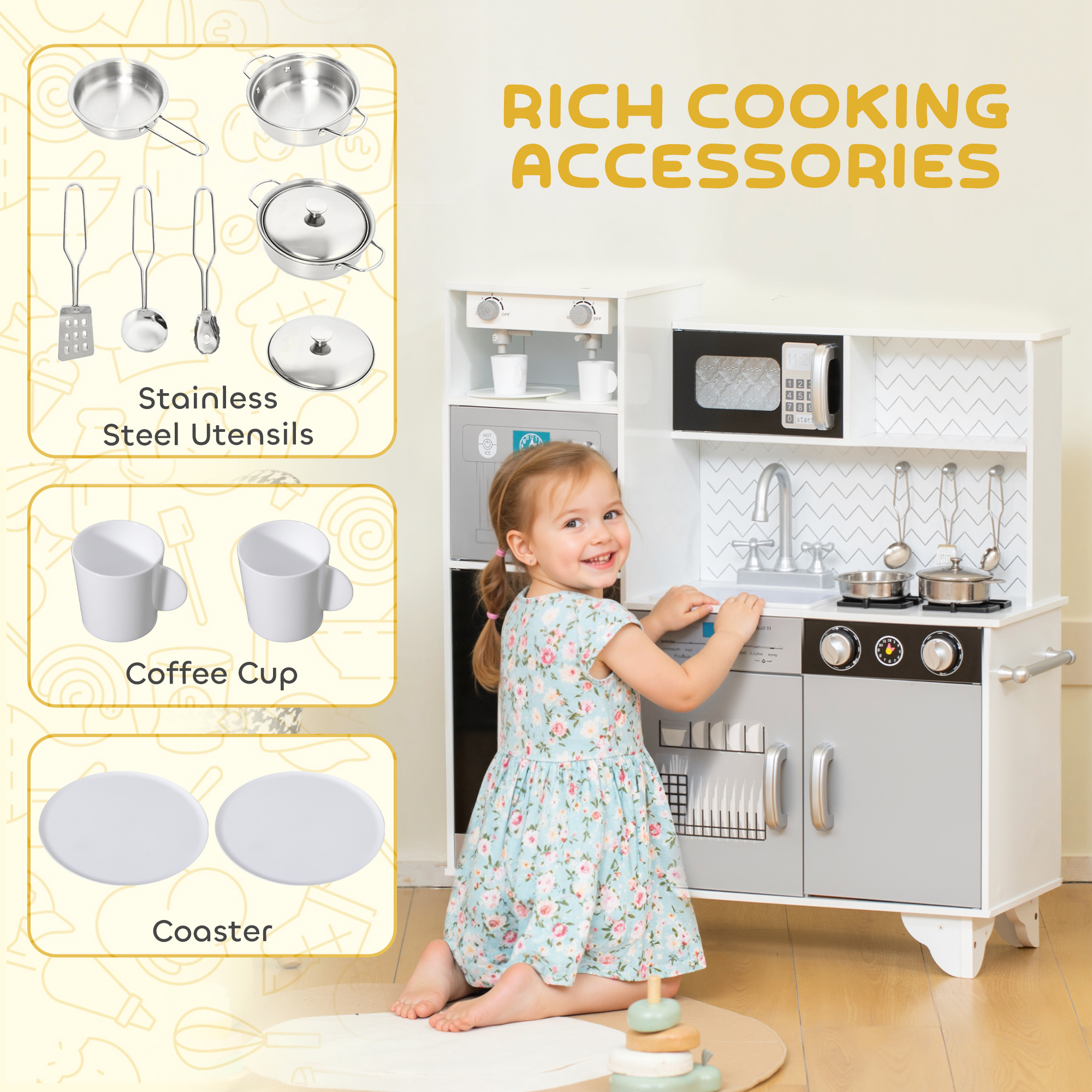 - Comes with stainless steel cookware and a coffee set for realistic roleplay