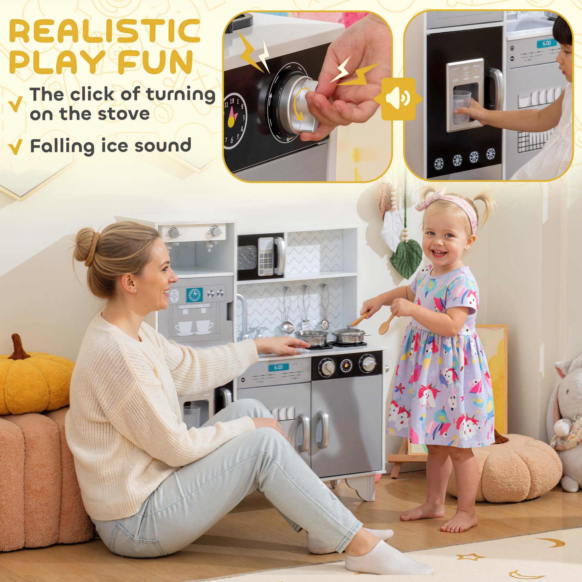 Their very own kitchen to get creative, this AIYAPLAY kids kitchen playset includes a pretend ice maker, coffee machine and stove top with realistic sounds – a charming setup that lets imaginations soar. Includes stainless steel accessories and play mugs, children can roleplay serving their favourite meals. The spacious storage provides a tidy play area, keeping accessories organised. A wonderful blend of fun and learning, it offers endless enjoyment while teaching kitchen etiquette.