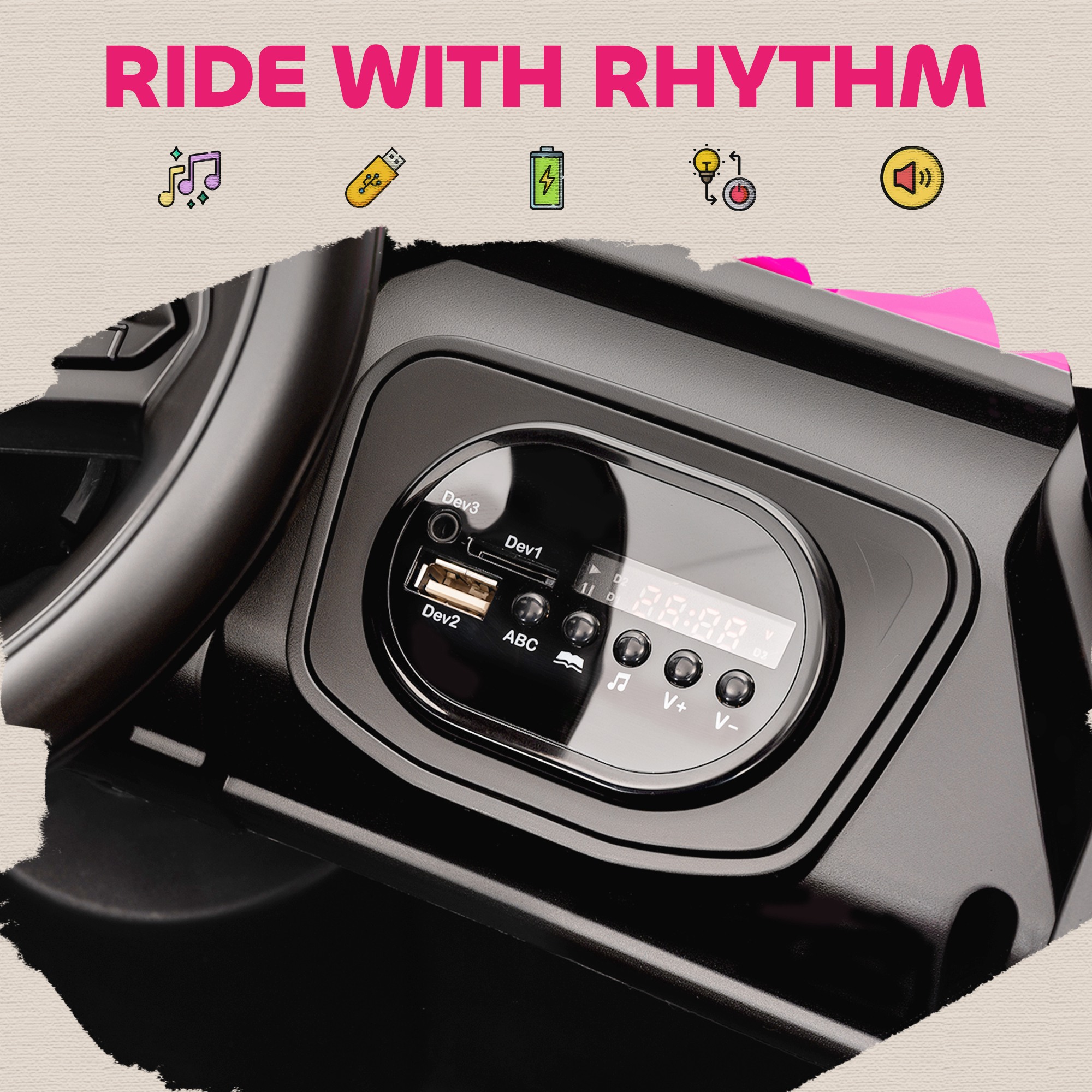 Dual 12V motors provide smooth rides, while the functional rear electric bucket lets kids transport small items like toys. With a soft start and four-wheel suspension, your child can enjoy stable journeys independently. Adults can join the fun using the remote control. USB, TF card and MP3 ports keep every ride accompanied by music, making each adventure joyful and immersive.