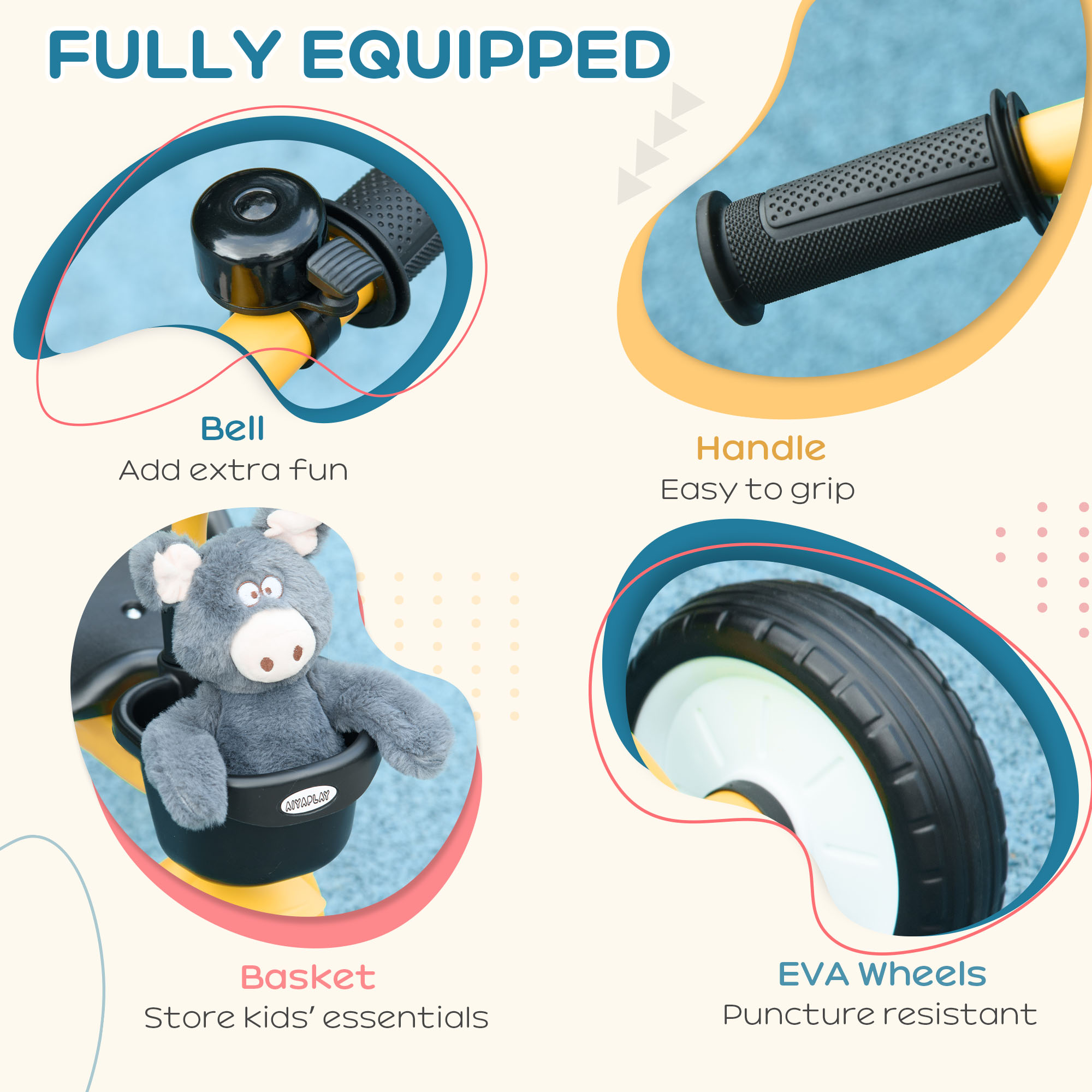 Begin your child's bike-riding journey with this AIYAPLAY baby trike. Designed to build confidence, it features a 10" front wheel and two 8" back wheels for a safe, smooth and secure experience. Suitable for ages 2-5 years, the adjustable seat ensures a comfortable fit. The front basket keeps toys and snacks nearby. Watch their skills blossom as they pedal their way to endless fun, getting them ready for thrilling and exciting adventures.