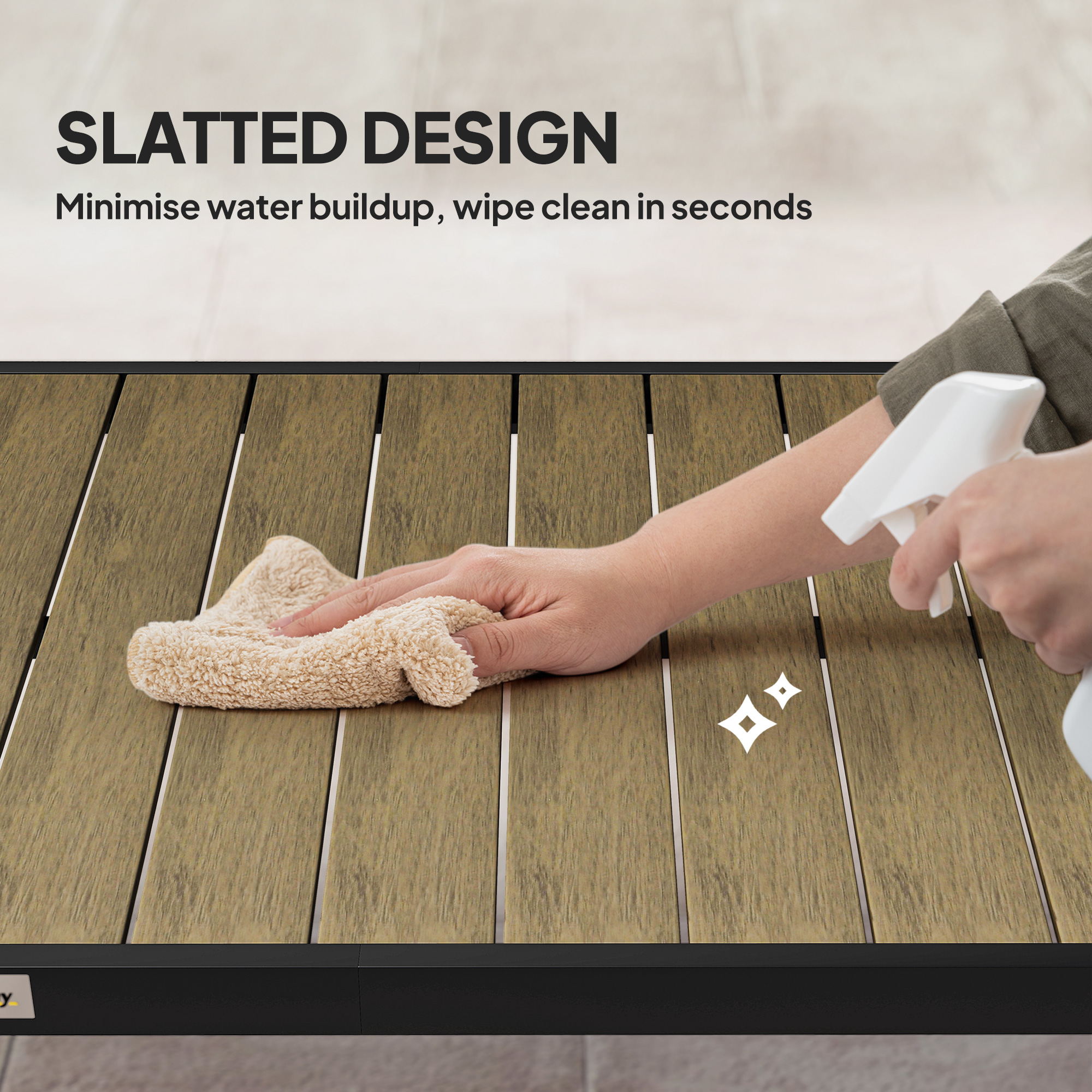 Serve dinner with plenty of company, thanks to this Outsunny garden table. Made from aluminium, the dinner table is a sleek piece which is also tough; the wood-effect finish gives it a beautiful look. Seats eight - plenty of room for you and company. Water-resistant makes it suitable for outdoor use. Complete with handy non-slip feet.