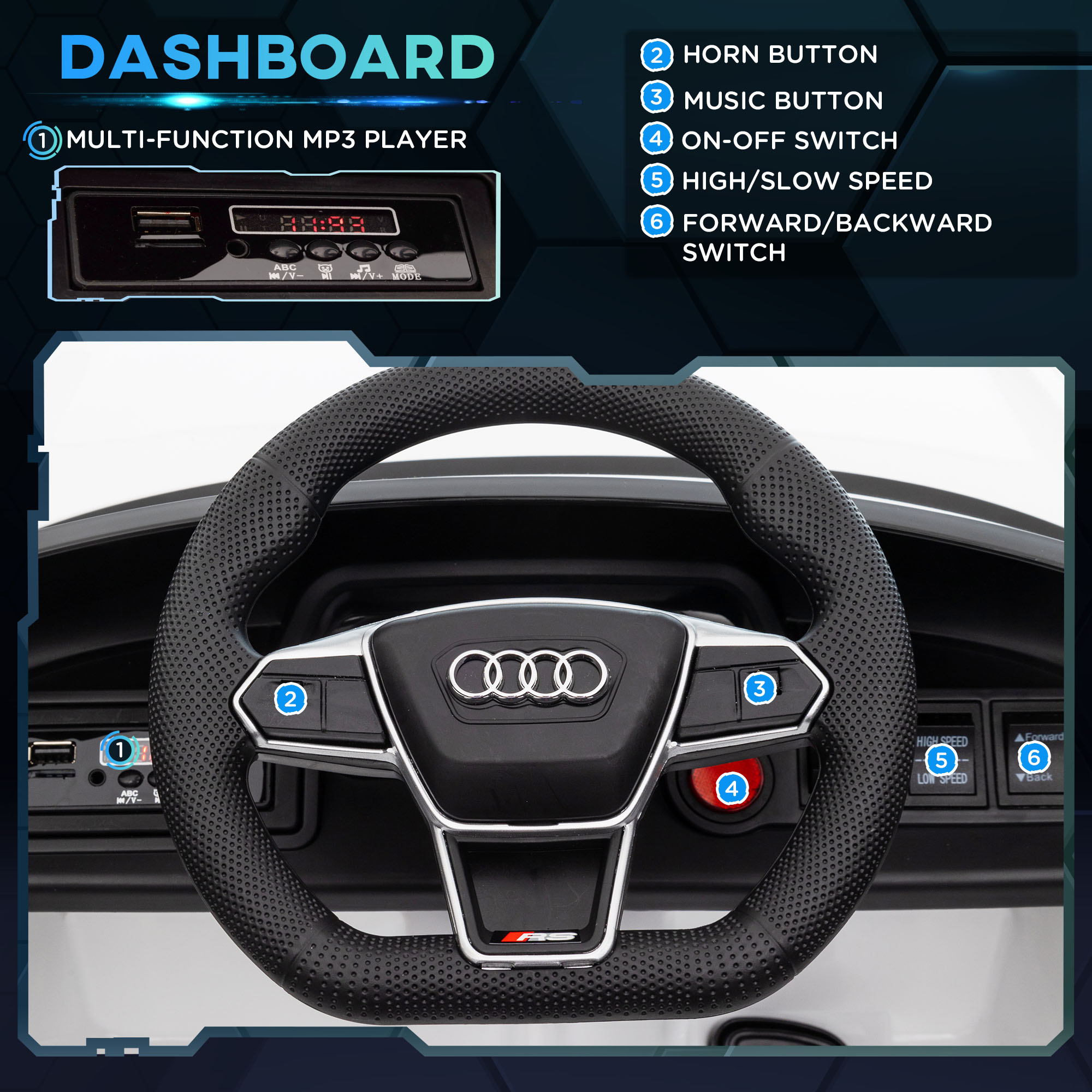 Thanks to this Audi licenced HOMCOM 12v kids' electric ride-on, kids will cruise in style with two-speed options. The LED lights, steering wheel and horn provide a realistic cruising experience, whilst their favourite songs will play through the USB or TF card slot. Parents can join the fun, using the remote control to navigate the ride-on, which has three-speed options. The seatbelt keeps children properly secure, whilst the wide wheels and shock absorption keep the ride safe and smooth.