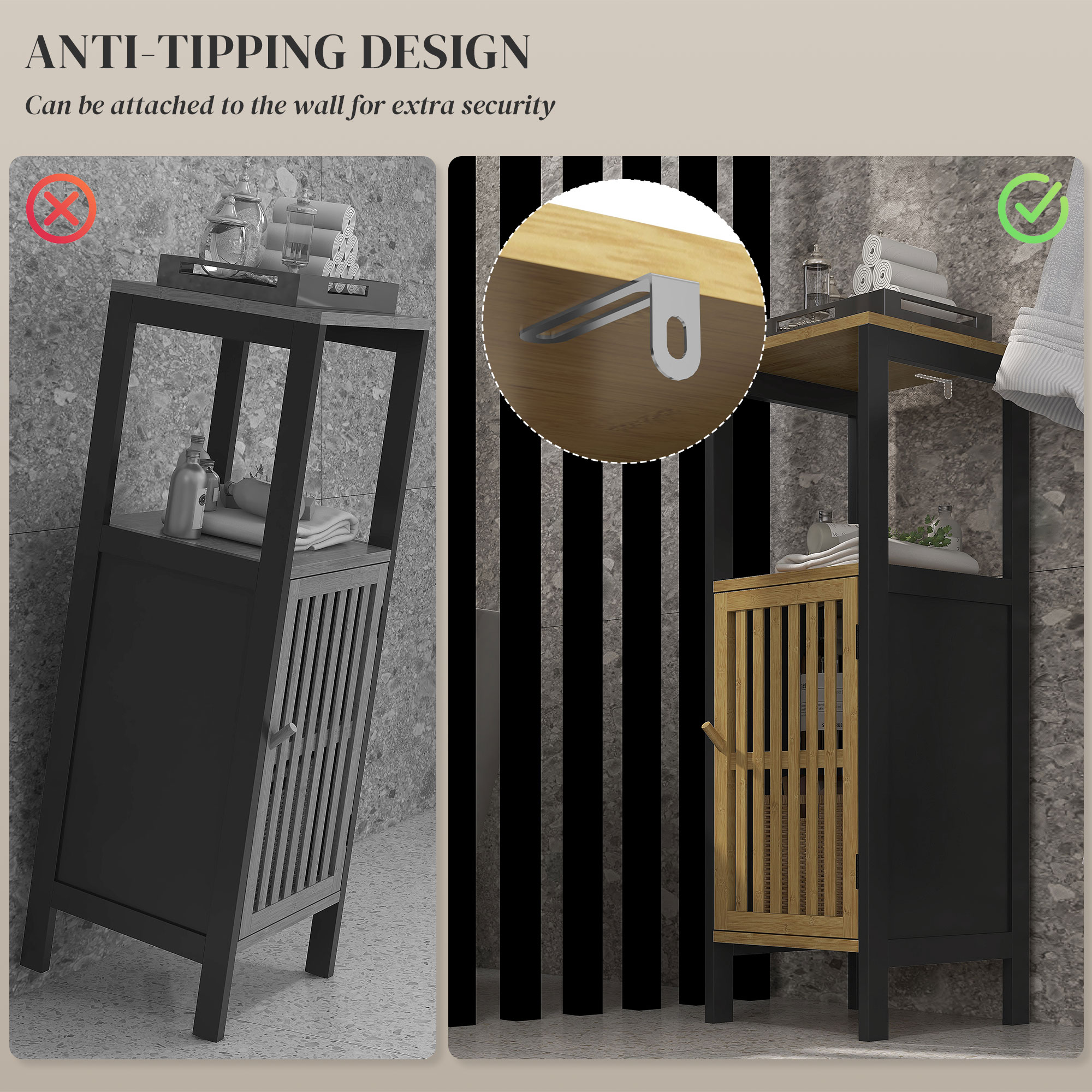 Retro charm for your bathroom, merged with adjustable storage. This HOMCOM slim storage cabinet combines a bottom cupboard and two upper shelves. Inside the cupboard there is a three-position adjustable shelf, so you can set it to the position you want. Made from a bamboo blend, this bathroom storage unit is a reliable piece, suitable for everyday use.