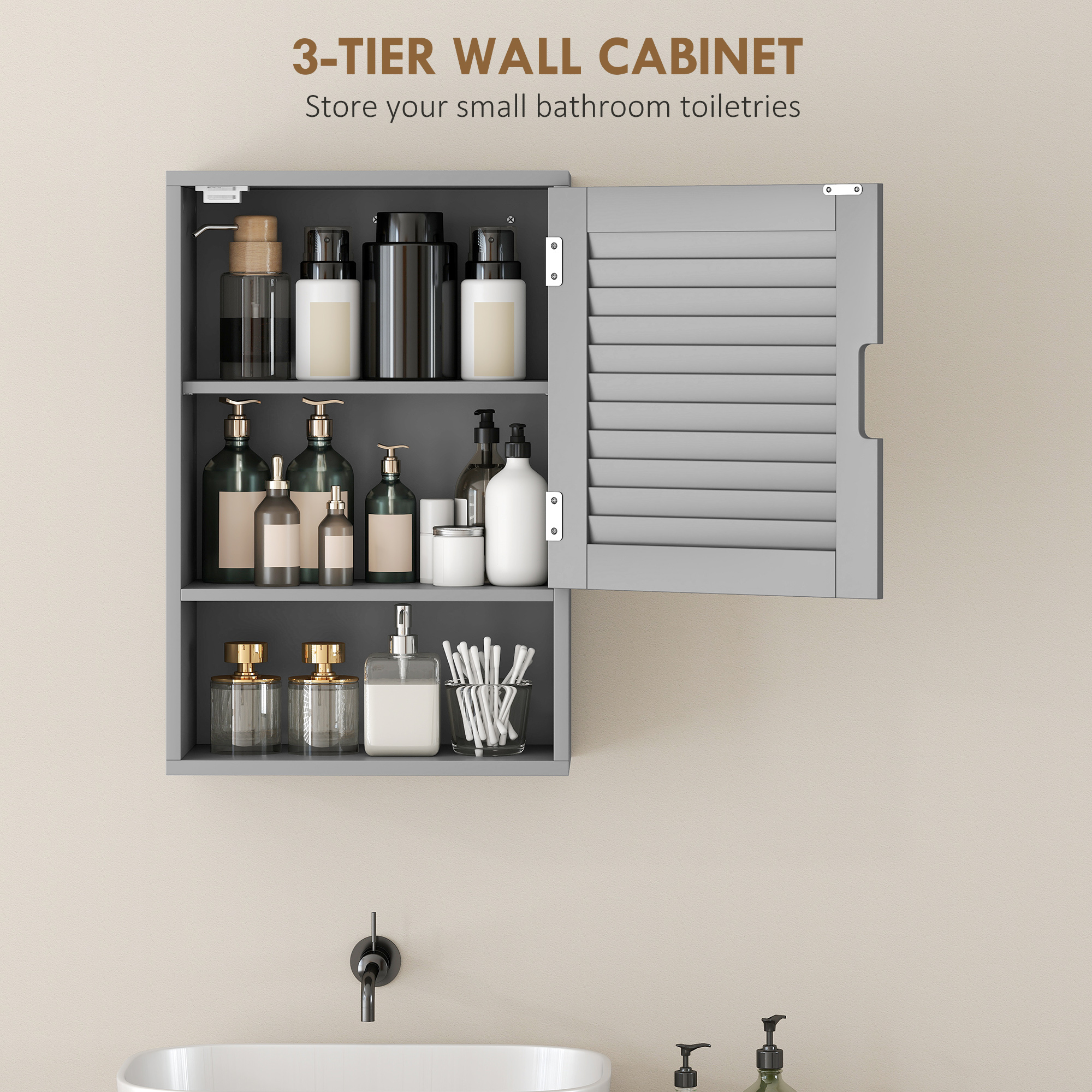 - Stylish grey finish and louvered door elevate your bathroom decor