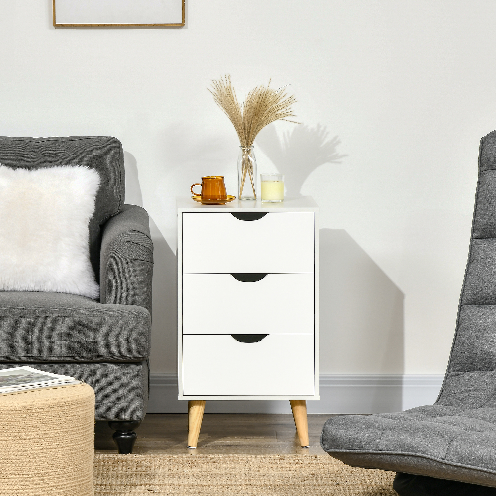 A stylish storage solution to update your bedroom: this HOMCOM telephone table. It comes with three drawers: good amount of for clothing. All drawers have cut-out groove handles to open and close easily. Made from particle board, this 3 drawer bedside table is stable, with wooden legs for strong support. Comes with anti-tipping straps to safely fix to a wall.