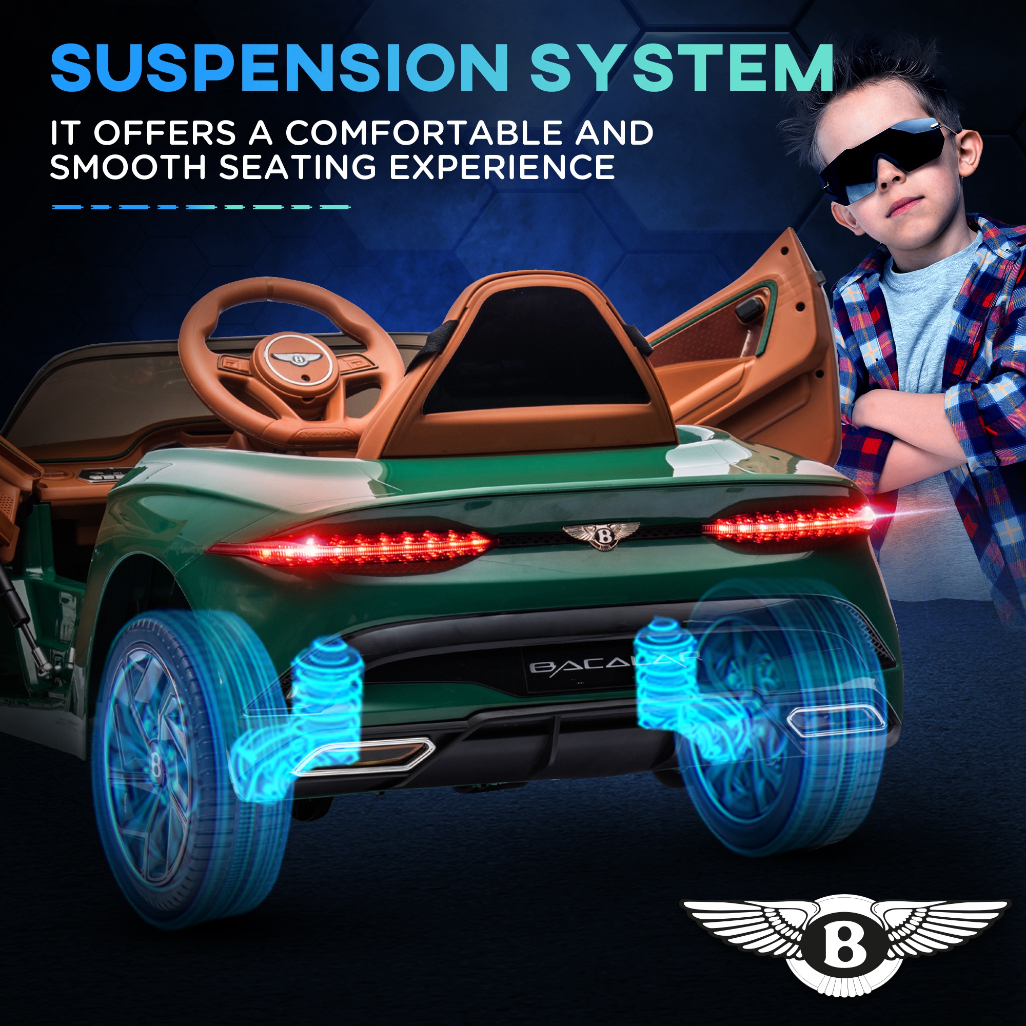 Fuel your child's imagination with this HOMCOM kids' electric ride-on car. Designed to amaze and excite, it's an officially licensed Bentley Bacalar; a sleek look with butterfly doors. Like a real car, they'll have music, a horn and headlights to play with, adding realism to make-believe games. Safety is the first priority – the wide wheels, shock-absorbing suspension system and seatbelt ensure this. There's even a remote control for adults to control the ride-on, so everyone can join the fun.