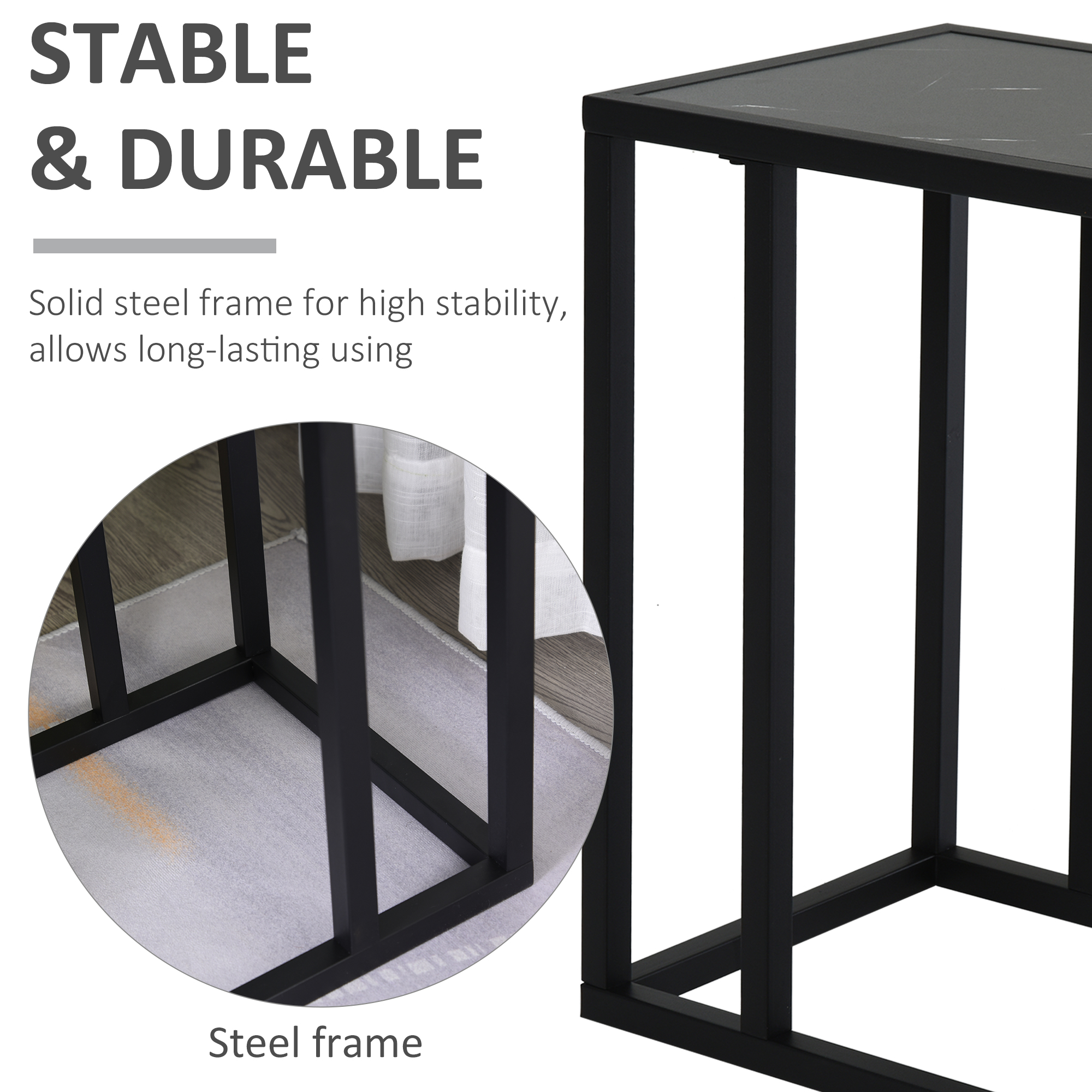 Add a touch of chic styling into your home with this table from HOMCOM. Crafted into a unique 'C' shape, it will bring in extra surface area without taking up too much room in the home. The frame is made from steel for a tough structure, with a particle board top for a solid and even surface, which is finished in a monochrome look. The extra-long base provides balance and stability, meaning this piece won't topple over easily. A sophisticated space-saver to love for years to come.