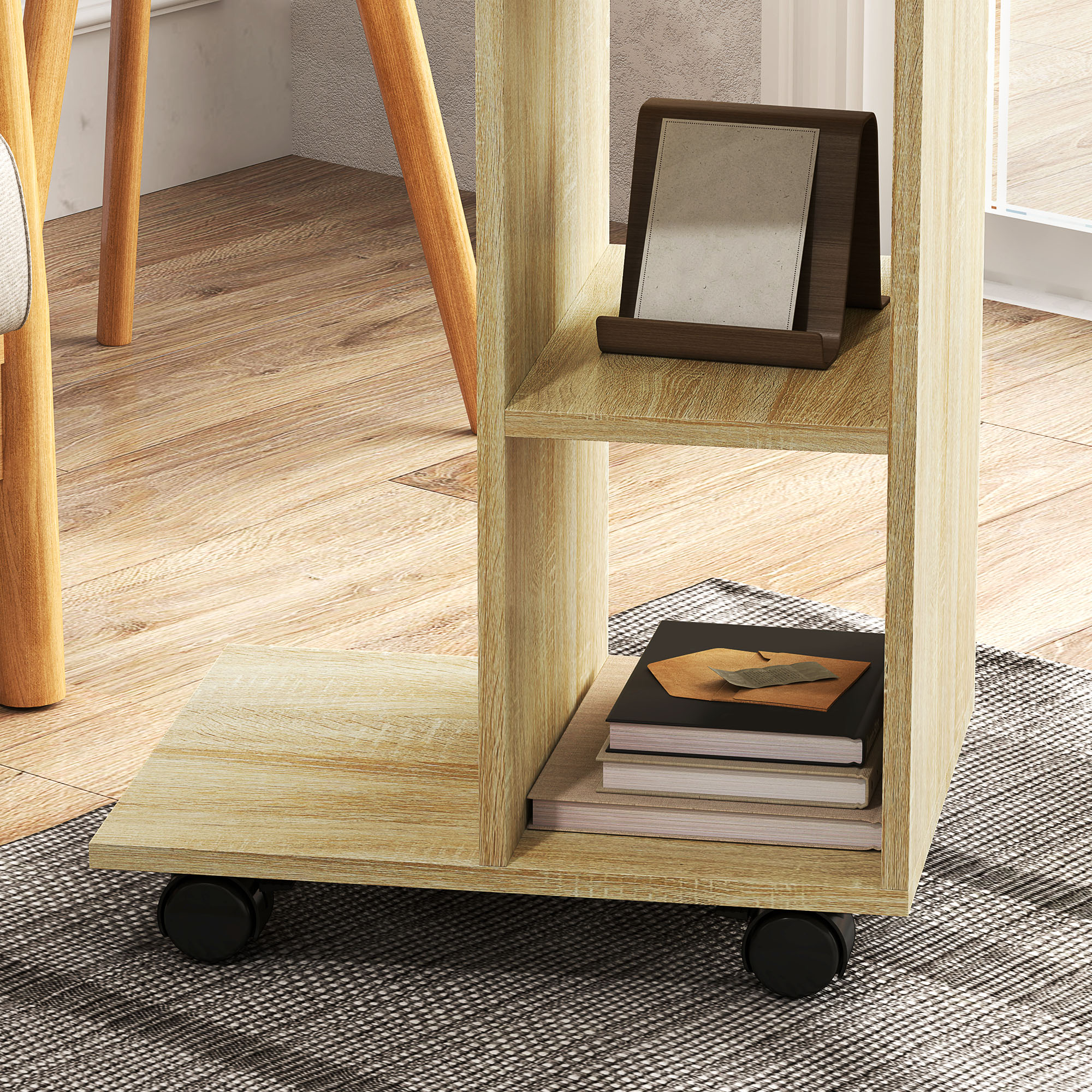 Let the unique design of this 'C' table, from HOMOM, lead the way for keeping your home tidy. Featuring two open shelves for storage and display. The open end can be used as both extra storage and slotting into spots to extend the surface space, with the four wheels allowing it to move easily; two can be locked to keep the table in place. It's finished with a melamine coating, making it smooth, protected against light markings and easy to clean.