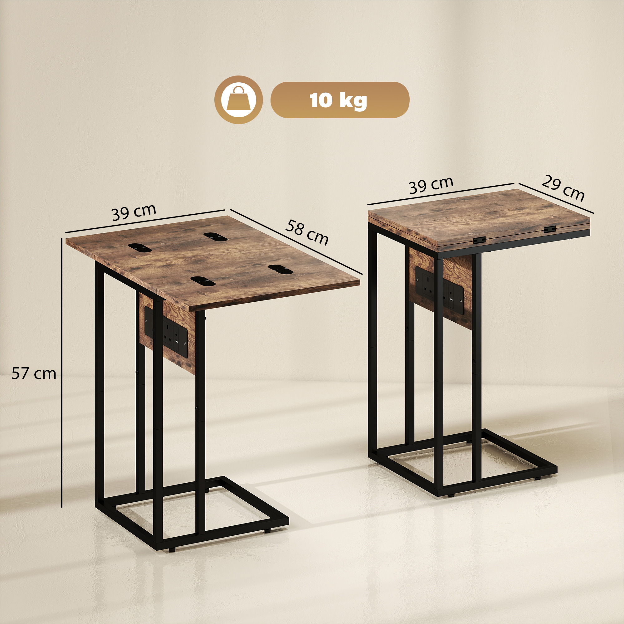 Transform your living space with this industrial side table from HOMCOM, complete with a charging station and a foldable tabletop that fits seamlessly into any room. Slide this C-shaped end table effortlessly under your sofa or bed, great for those snug nooks. Whether you need a convenient bedside table, a handy sofa sidekick, or an efficient workspace, this small table adapts to your lifestyle with style and functionality.