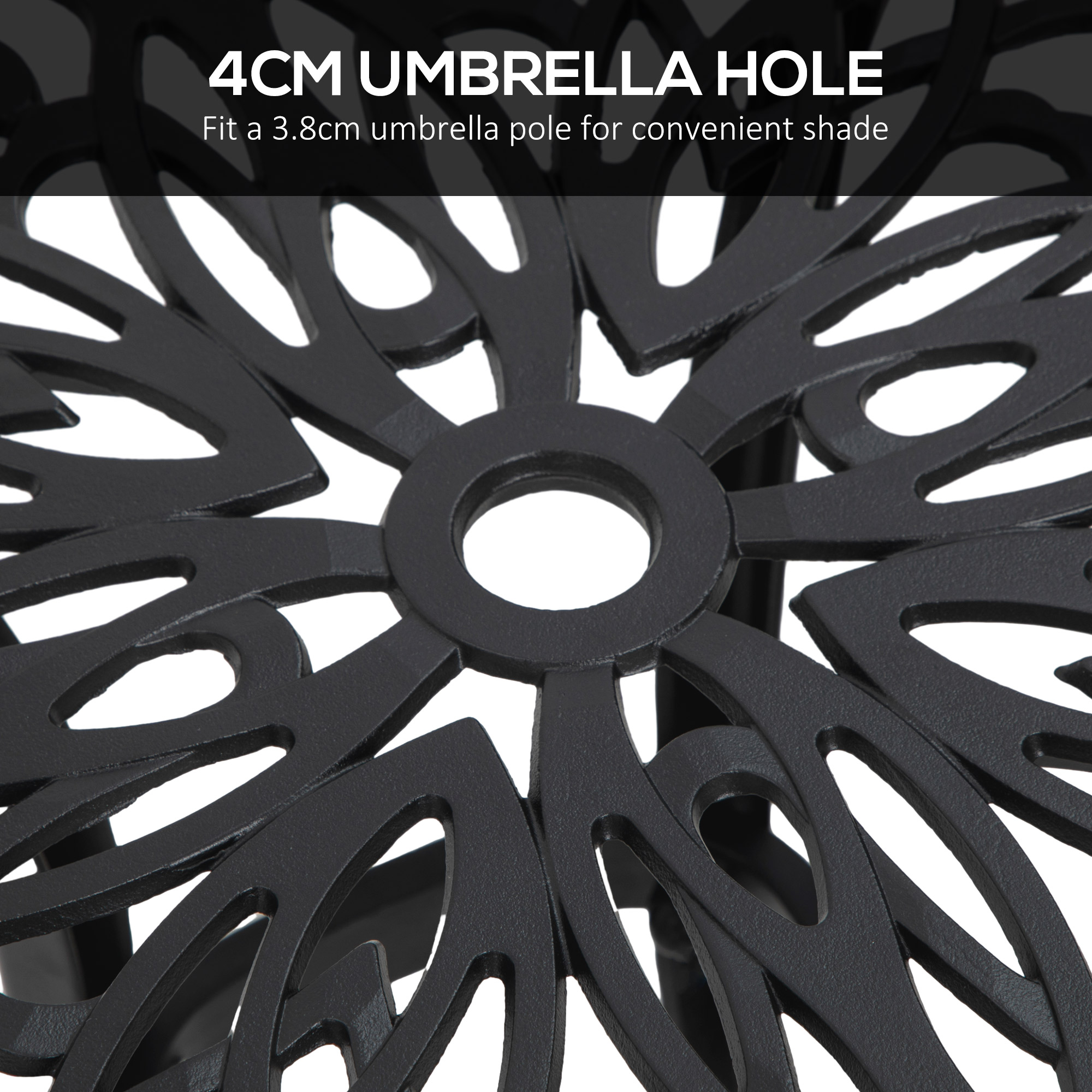 Enhance your outdoor with this Outsunny bistro table. Comes with a floral cut-out tabletop with curved legs for a beautiful design. Made from cast aluminium frame, with a powder coated finish, this is a strong outdoor coffee table suitable for year-round year. Comes with a Ф3. 55 cm central hole to hold parasol in place.