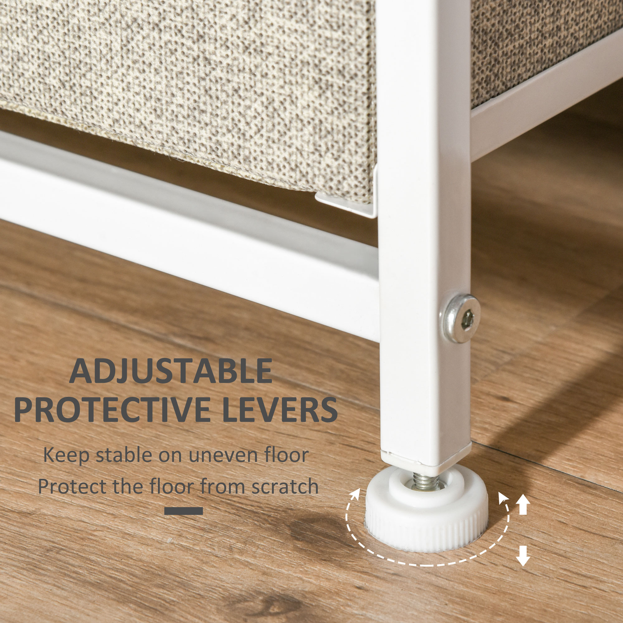 The HOMCOM bedroom chest of drawers is the great solution for keeping your bedroom organized. Built with a stable steel frame and engineered wood top, it provides reliable display space. With four small drawers and three large ones, it offers generous storage for clothes and other essentials. The adjustable feet ensure stability, making it suitable as a bedroom dresser, bedroom unit, or stylish fabric drawer for any modern space.