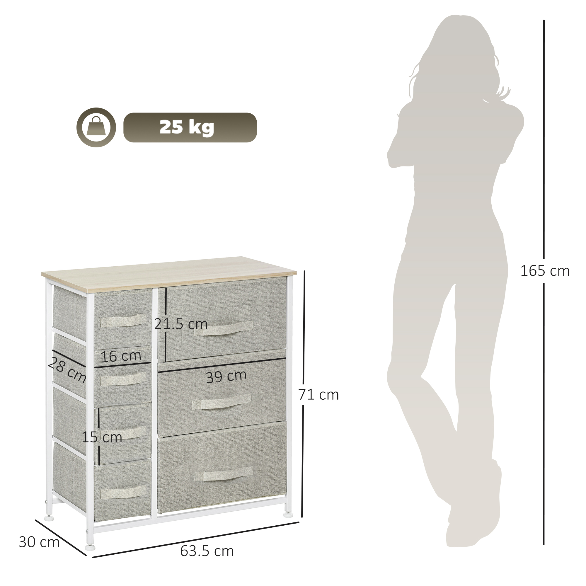 - Removable fabric drawers for easy storage of everyday items
