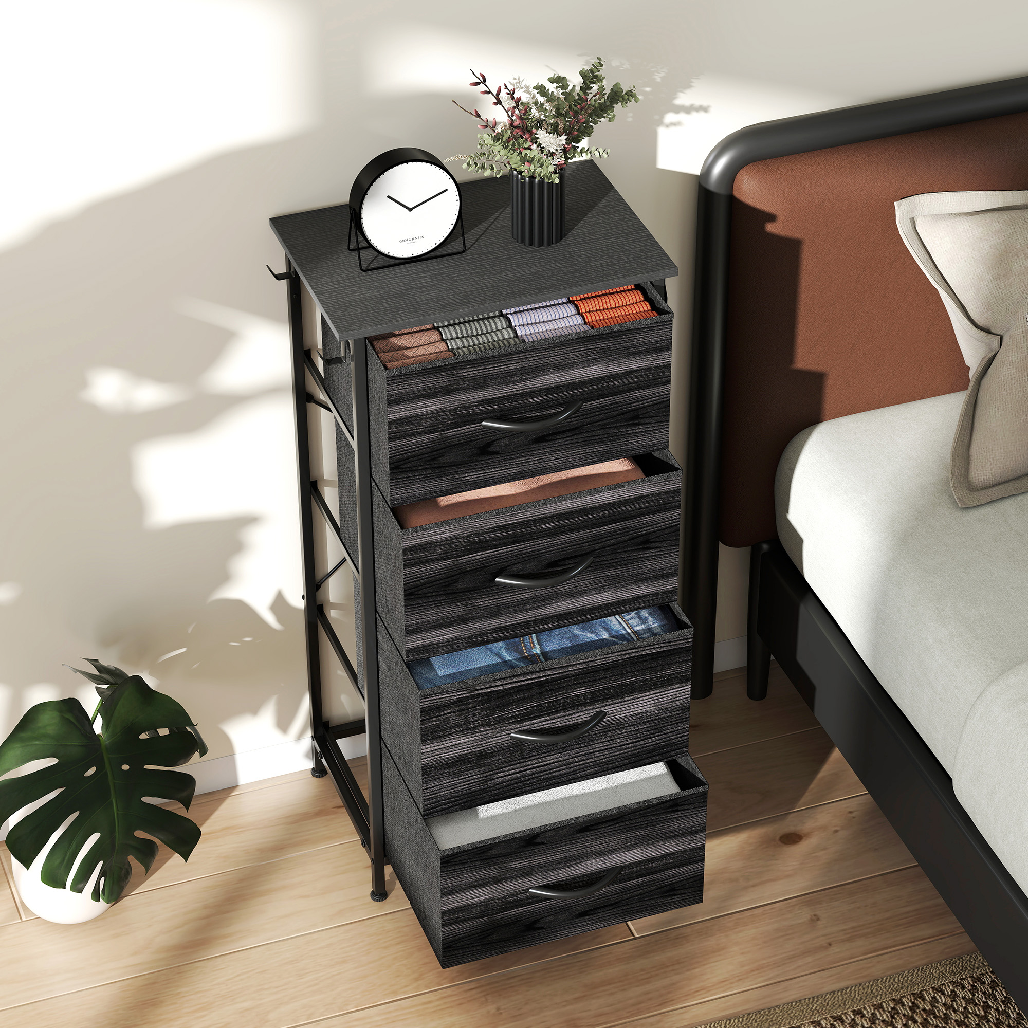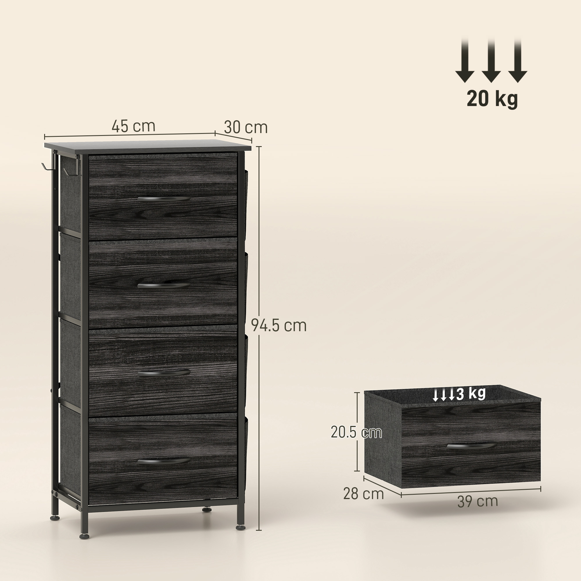 Easy, simple storage with this HOMCOM fabric chest of drawers. With four same drawers, it's easy to sort everything from socks to pants. It also features four side pockets and two hooks to get smaller accessories altogether. A steel frame with X-bars keeps this bedroom dresser stable, finished with adjustable feet for balance - even on unsteady grounds.