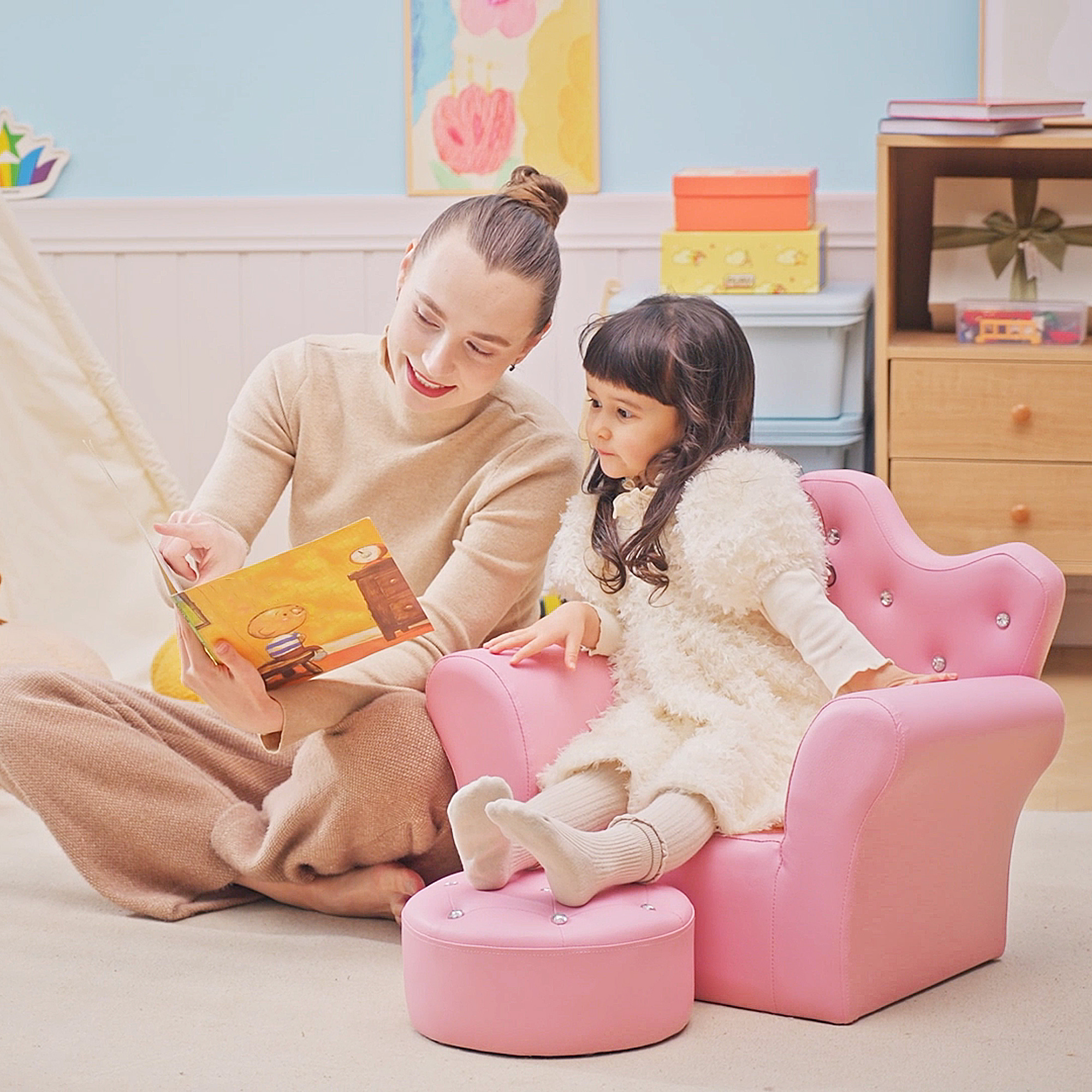 - Crown modeling backrest and bright crystal buttons on chair and footstool make kid's eyes light up