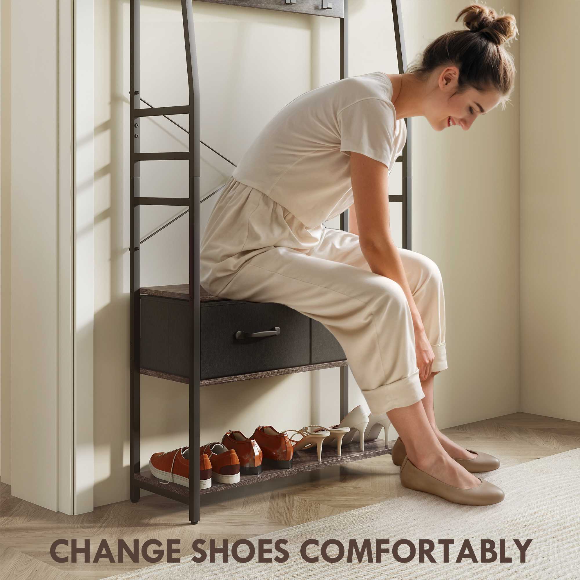 Features: - 6-in-1 design: combines a hanging rail, a shoe bench, a shoe rack, a storage shelf, fabric drawers and coat hooks