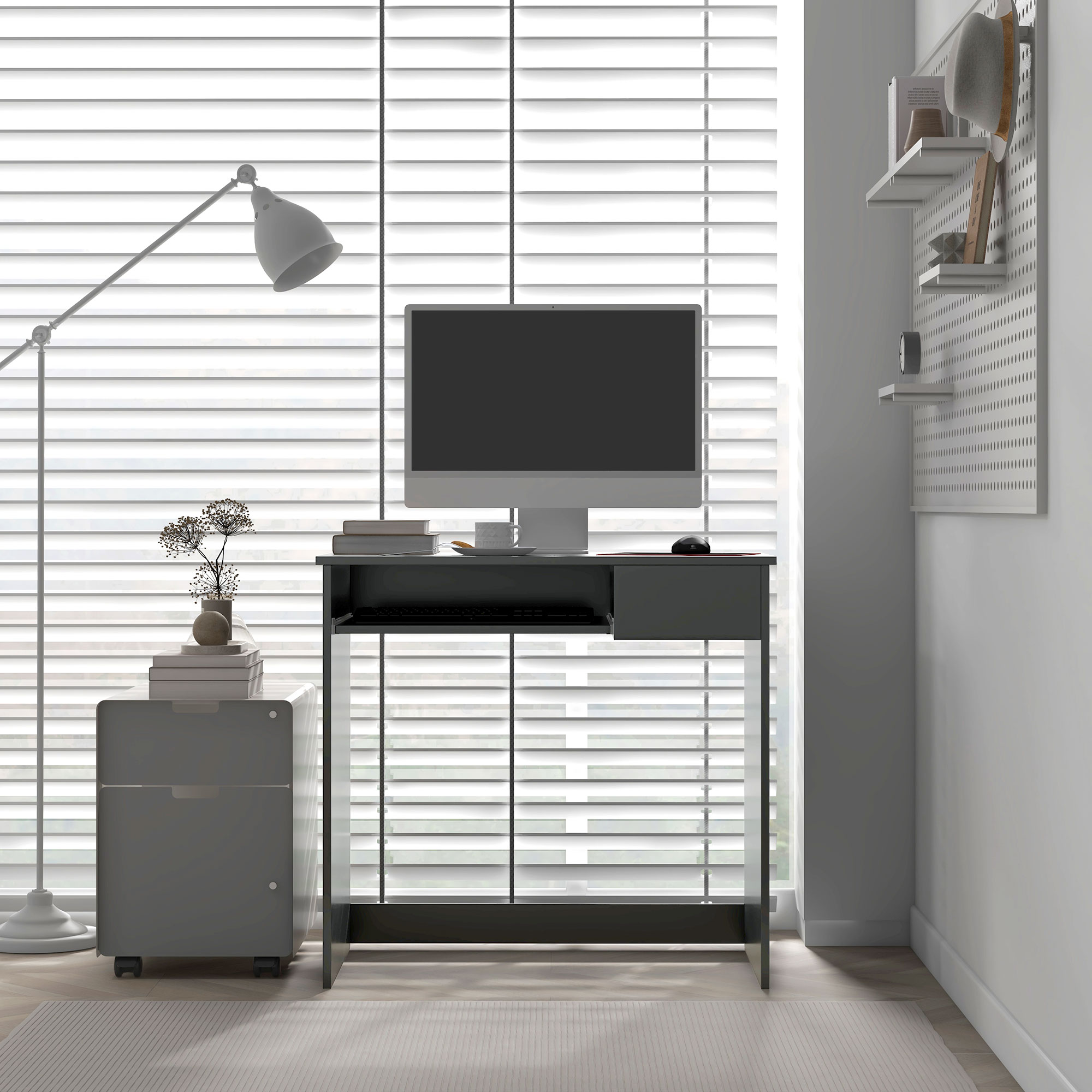 Efficiently save space with this computer desk from HOMCOM. Featuring a keyboard tray and a drawer, it saves a lot of desktop space. Constructed of particle board with grey surface, it's easy to maintain and brings you the atmosphere of nature. Its contemporary look will blend beautifully into any style decor. It's a great choice for you to have this desk in your study, office, or bedroom to enrich your furniture while saving space!
